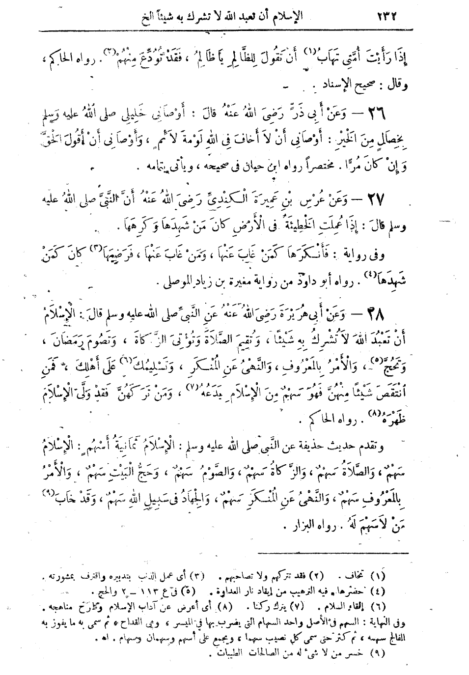 28 - وعن أبي هريرة رضي الله عنه عن النبي صلى الله عليه وسلم قال: "الإسلام أن تعبد الله لا تشرك به شيئاً، وتقيم الصلاة وتؤتي الزكاة، وتصوم رمضان، وتحج (¬5)، والأمر بالمعروف، والنهي عن المنكر، وتسليمكَ (¬6) على أهلك، فمن انتقص شيئاً منهن فهو سهمٌ من الإسلام يدعه (¬7)، ومن تركهن، فقد وَلَّى الإسلام ظهره (¬8) " رواه الحاكم.
