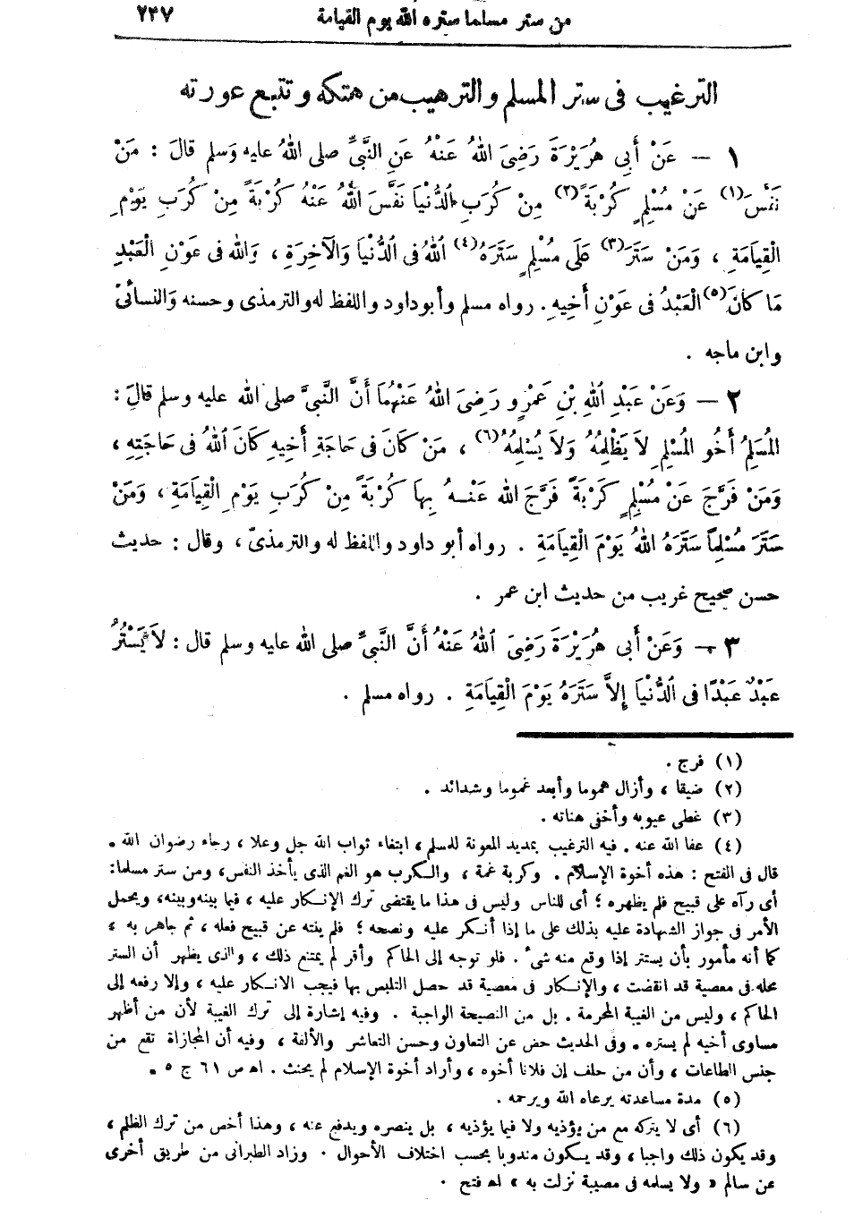 1 - عن أبي هريرة رضي الله عنه عن النبي صلى الله عليه وسلم قال: "من نَفَّسَ (¬1) عن مسلمٍ كُربةً (¬2) من كُربِ الدنيا نَفَّسَ الله عنه كربةً من كُرَبِ يوم القيامة، ومن ستر (¬3) علىمسلم ستره (¬4) الله في الدنيا والآخرة، والله في عون العبد ما كان (¬5)