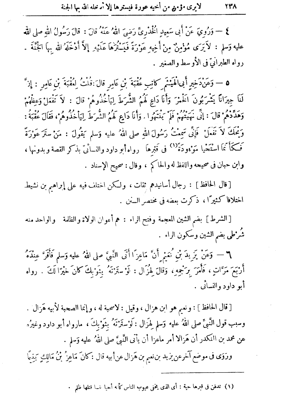 5 - وعن دَخيرٍ أبي الهيثم كاتب عقبة بن عامر قال: "قلتُ لعقبة بن عامرٍ: إن لنا جيراناً يشربون الخمرَ وأنا داعٍ لهمُ الشُّرَطَ ليأخذوهم قال: لا تفعل وَعِظْهُمْ وَهَدِّدْهُمْ قال: إني نَهَيْتُهمْ فلم ينتهوا، وأنا داعٍ لهم الشُّرَطَ ليأخذوهم، فقال عقبةُ: وَيحكَ لا تفعل فإني سمعتُ رسول الله صلى الله عليه وسلم يقول: من ستر عورةً فكأنما استحيا مَوْءُدَةً (¬1) في قبرها" رواه أبو داود والنسائي بذكر القصة وبدونها، وابن حبان في صحيحه واللفظ له والحاكم، وقال: صحيح الإسناد.
