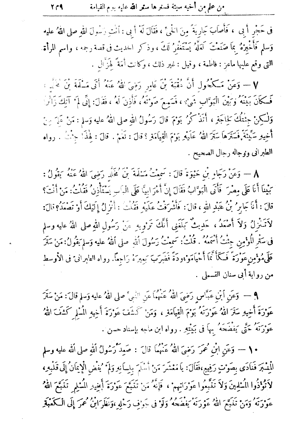 8 - وعن رجاء بن حَيْوَةَ قال: "سمعتُ مَسْلَمَةَ بن مُخَلَّدٍ رضي الله عنه يقول: بينا أنا على مِصْرَ فأتى البواب فقال إن أعرابياً على الباب يستأذنُ فقلتُ: من أنت؟ قال: أنا جابر بن عبد الله، قال: فأشرَفتُ عليه فقلتُ: أنزلُ إليك أو تصعدُ؟ قال: لا تنزل ولا أصعدُ، حديثٌ بلغني أنك تَرْوِيِهِ عن رسول الله صلى الله عليه وسلم في ستر المؤمن، جئت أسمعهُ. قلت: سمعتُ رسول الله صلى الله عليه وسلم يقول: من ستر على مؤمنٍ عورةً فكأنما أحيا موءودةً فضرب بعيرهُ راجعاً" رواه الطبراني في الأوسط من رواية أبي سنان القسملي.