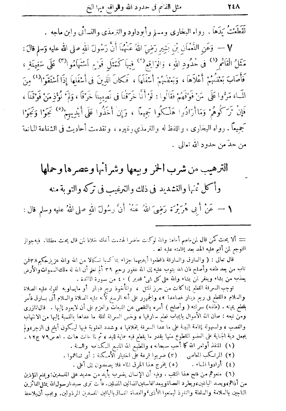 7 - وعن النعمان بن بشير رضي الله عنهما أن رسول الله صلى الله عليه وسلم قال: "مَثَلُ القائمِ (¬1) في حدود الله، والواقعِ (¬2) فيها كمثل قومٍ اسْتَهَامُوا (¬3) على سفينةٍ، فأصاب بعضهم أعلاها، وبعضهم أسفلها، فكان الذين في أسفلها إذا اسْتَقَوْا (¬4) من الماء مَرُّوا على من فوقهم فقالوا: لو أنا خرقنا في نصيبنا خرقاً (¬5)، ولم نُؤذِ من فوقنا، فإن تركوهم وما أرادوا هلكوا جميعاً، وإن أخذوا على أيديهم (¬6) نجوا وَنَجَوْا جميعاً" رواه البخاري، واللفظ له والترمذي وغيره، وتقدمت أحاديث في الشفاعة المانعة من حد من حدود الله تعالى.