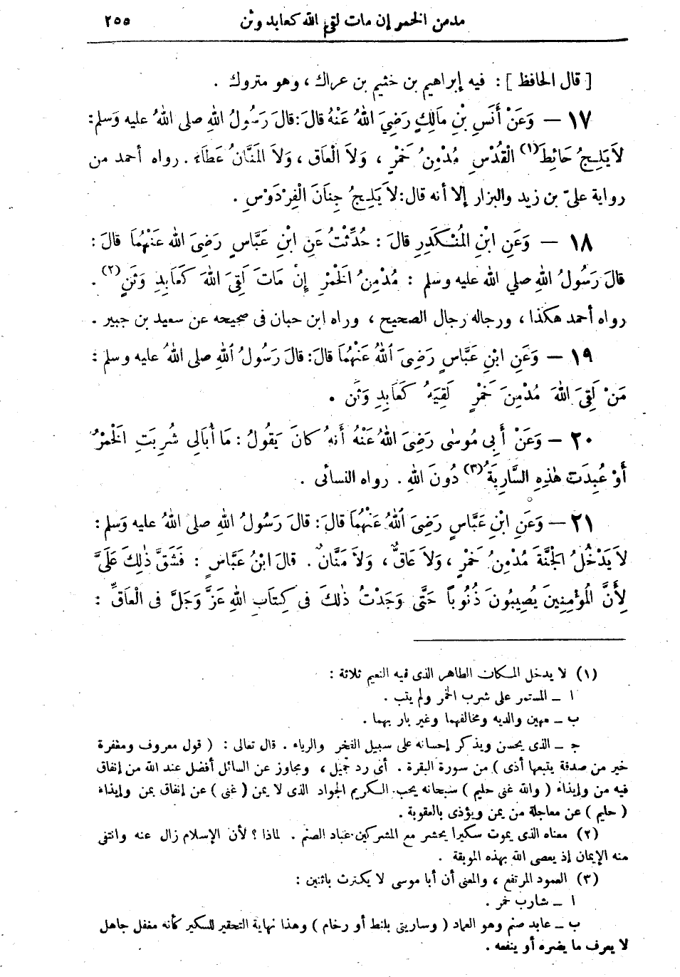 18 - وعن ابن المنكدر قال: حُدِّثْتُ عن ابن عباس رضي الله عنهما قال: قال رسول الله صلى الله عليه وسلم: "مدمن الخمر إن مات لقي الله كعابد وثنٍ (¬2) " رواه أحمد هكذا، ورجاله رجال الصحيح، ورواه ابن حبان في صحيحه عن سعيد بن جبير.