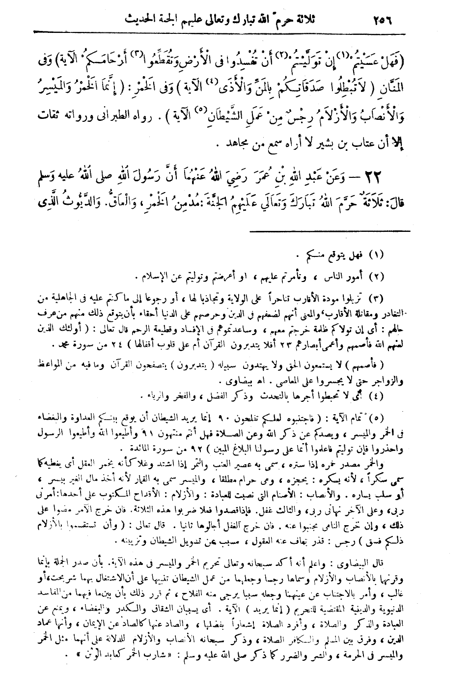 (¬5) تمام الآية: "فاجتنبوه لعلكم تفلحون إنما يريد الشيطان أن يوقع بينكم العداوة والبغضاء في الخمر والميسر، ويصدكم عن ذكر الله وعن الصلاة فهل أنتم منتهون وأطيعوا الله وأطيعوا الرسول واحذروا فإن توليتم فاعلموا أنما على رسولنا البلاغ المبين" (90 - 92 من سورة المائدة).