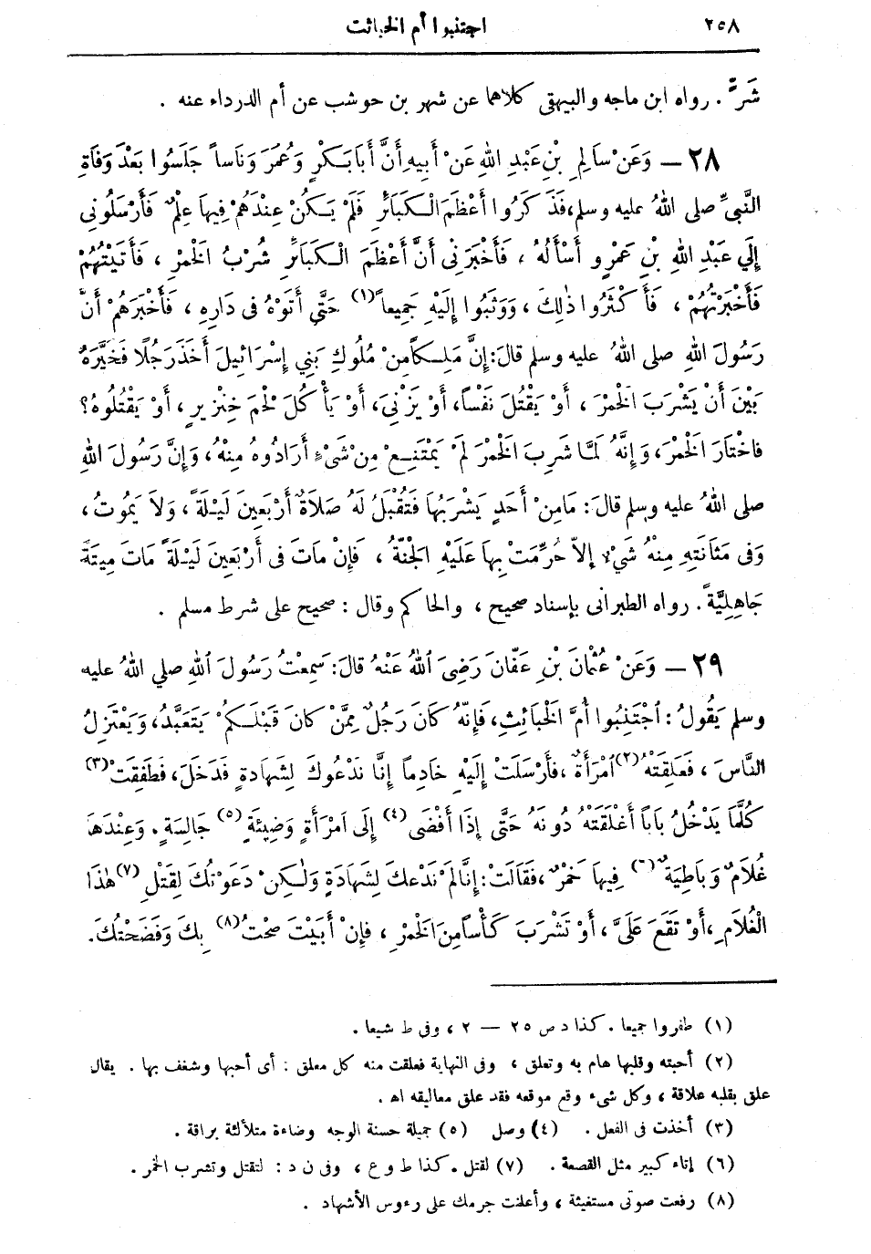 28 - وعن سالم بن عبد الله عن أبيه أن أبا بكرٍ وعمر، وناساً جلسوا بعد وفاة النبي صلى الله عليه وسلم، فذكروا أعظم الكبائر فلم يكن عندهم فيها علمٌ فأرسلوني إلى عبد الله بن عمروٍ أسألهُ، فأخبرني أن أعظم الكبائر شرب الخمرِ، فأتيتهم فأخبرتهم، فأكثروا ذلك، وَوَثَبُوا إليه جميعاً (¬1) حتى أَتَوْهُ في دارهِ، فأخبرهم أن رسول الله صلى الله عليه وسلم قال: "إن ملكاً من مُلوكِ بني إسرائيل أخذ رجلاً فَخَيَّرَهُ بين أن يشرب الخمر، أو يقتل نفساً، أو يزني، أو يأكل لحم خنزيرٍ، أو يقتلوهُ؟ فاختار الخمر، وإنه لما شَرِبَ الخمر لم يمتنع من شيء أرادوه منه، وأن رسول الله صلى الله عليه وسلم قال: ما من أحدٍ يشربها فَتُقْبَلَ له صلاةُ أربعين ليلةً، ولا يموتُ، وفي مثانتهِ منه شيء إلا حُرِّمَتْ بها عَليه الجنة، فإن مات في أربعين ليلةً مات ميتةً جاهليةً" رواه الطبراني بإسناد صحيح، والحاكم وقال: صحيح على شرط مسلم.