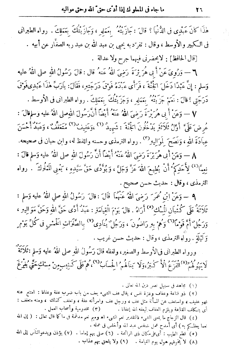 7 - وعن أبي هريرة رضي الله عنه أيضاً أن رسول الله صلى الله عليه وسلم قال: عُرِضَ عليَّ أولُ ثلاثةٍ يدخلون الجنة: شهيد (¬1)، وعفيفٌ (¬2) مُتَعففٌ، وعَبدٌ أحسن عبادة الله، ونصح لمواليه (¬3) " رواه الترمذي وحسنه واللفظ له، وابن حبان في صحيحه.