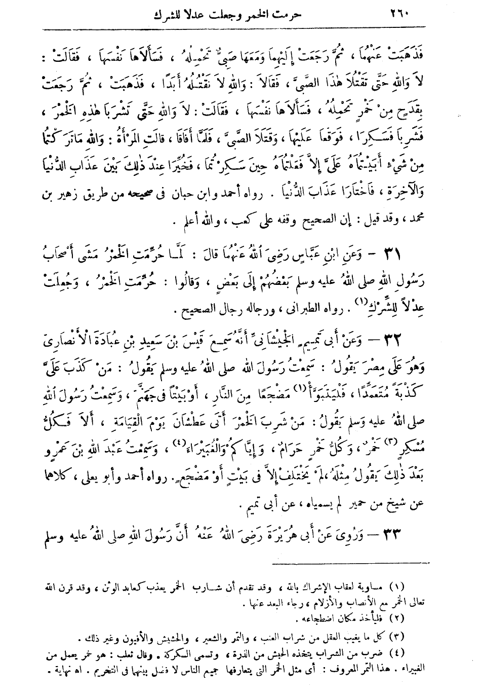 31 - وعن ابن عباس رضي الله عنهما قال: "لما حُرِّمَتِ الخمرُ مشى أصحابُ رسول الله صلى الله عليه وسلم بعضهم إلى بعضٍ، وقالوا: حُرِّمَتِ الخمرُ، وجُعِلَتْ عِدْلاً للشرك (¬1) " رواه الطبراني، ورجاله رجال الصحيح.