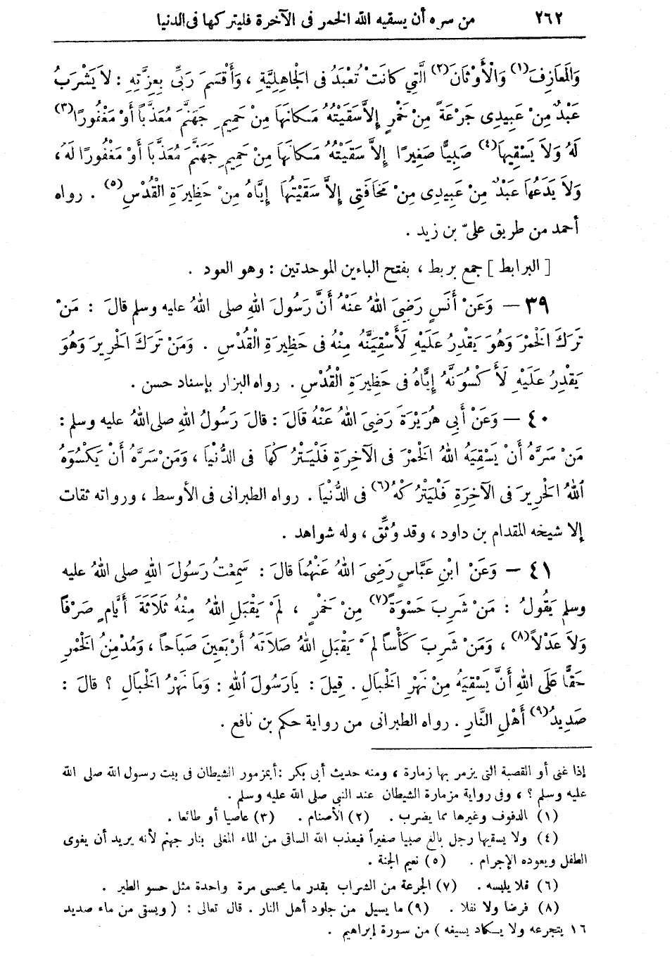 40 - وعن أبي هريرة رضي الله عنه قال: قال رسول الله صلى الله عليه وسلم: "من سره أن يسقيه الله الخمر في الآخرة فليتركها في الدنيا، ومن سره أن يكسوهُ الله الحريرَ في الآخرة فليتركهُ (¬6) في الدنيا" رواه الطبراني في الأوسط، ورواته ثقات إلا شيخه المقدام بن داود، وقد وُثِّق، وله شواهد.