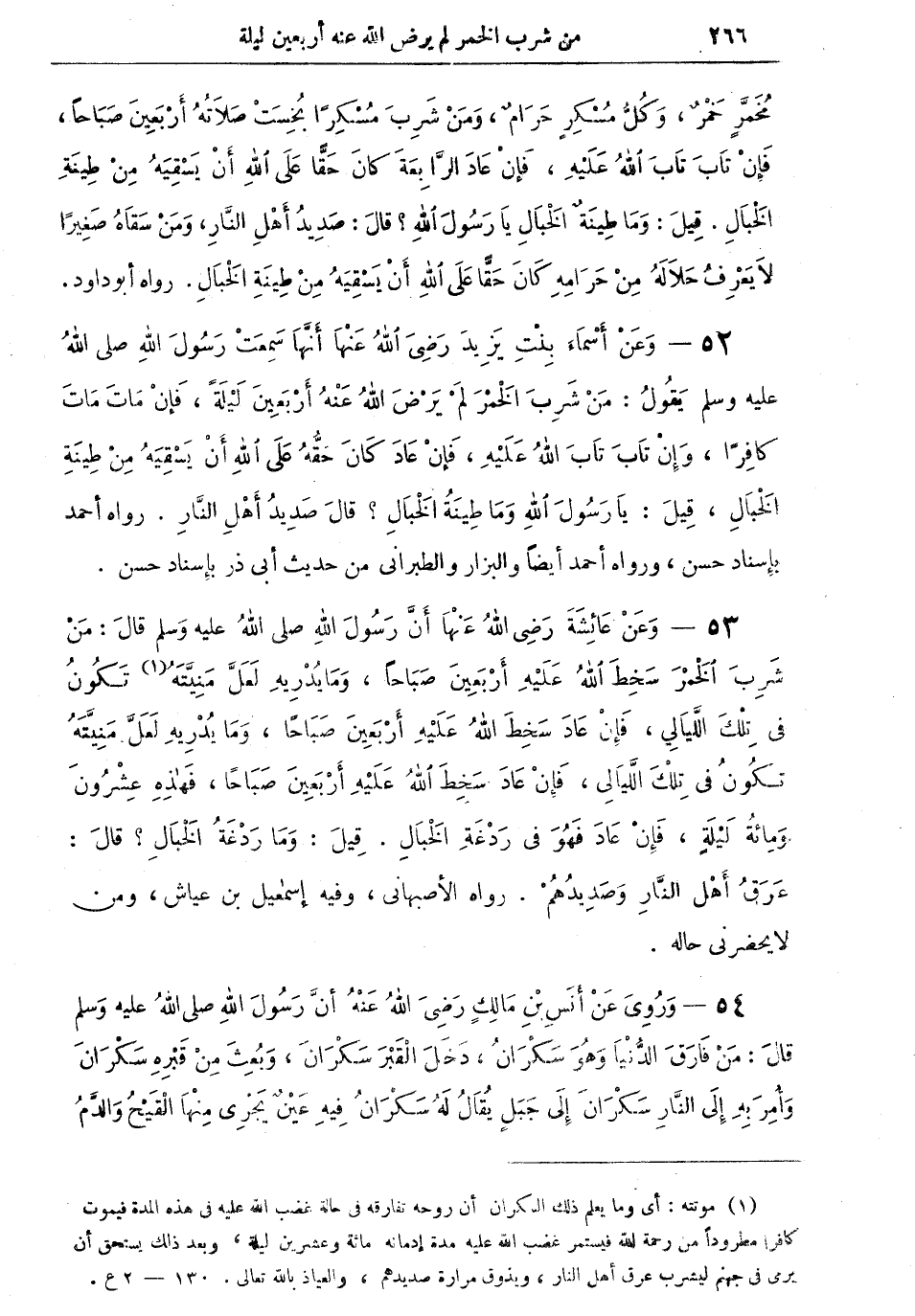 52 - وعن أسماء بنت يزيد رضي الله عنها أنها سمعت رسول الله صلى الله عليه وسلم يقول: "من شرب الخمر لم يرضَ الله عنه أربعين ليلةً، فإن مات مات كافراً، وإن تاب تابَ الله عليه، فإن عاد كان حقهُ على اللهِ أن يسقيهُ من طينةِ الخبال، قيل: يا رسول الله وما طينة الخبال؟ قال: صديد أهل النار" رواه أحمد بإسناد حسن، ورواه أحمد أيضاً والبزار والطبراني من حديث أبي ذر بإسناد حسن.