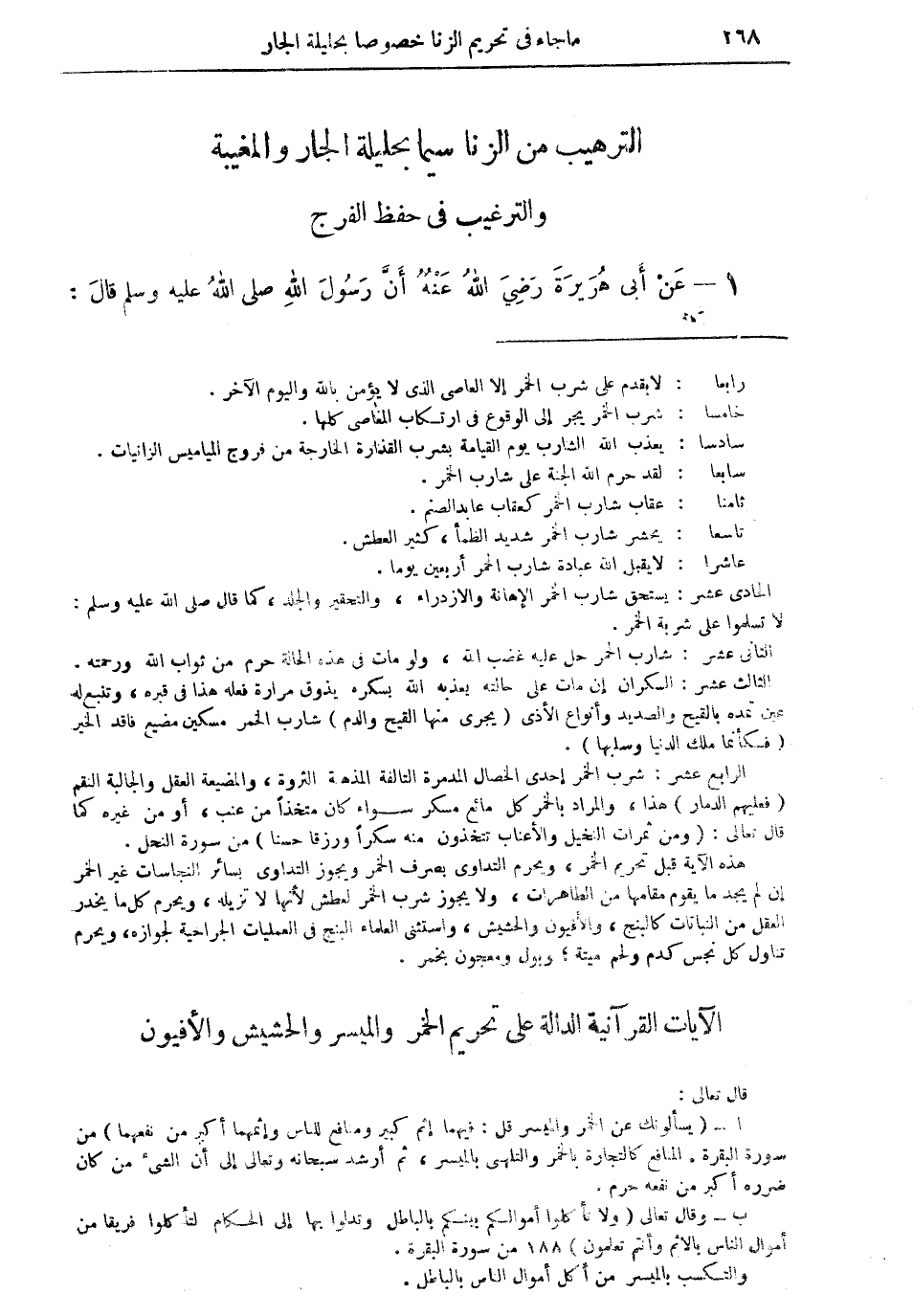 الرابع عشر: شرب الخمر إحدى الخصال المدمرة التالفة المذهبة الثروة؛ والمضيعة العقل والجالبة النقم (فعليهم الدمار) هذا، والمراد بالخمر كل مائع مسكر سواء كان متخذاً من العنب، أو من غيره كما قال تعالى: "ومن ثمرات النخيل والأعناب تتخذون منه سكراً ورزقاً حسناً" من سورة النحل. هذه الآية قبل تحريم الخمر، ويحرم التداوي بصرف الخمر ويجوز التداوي بسائر النجاسات غير الخمر إن لم يجد ما يقوم مقامها من الطاهرات، ولا يجوز شرب الخمر لعطش لأنها لا تزيله، ويحرم كل ما يخدر العقل من النباتات كالبنج، والأفيون والحشيش، واستثنى العلماء البنج في العمليات الجراحية لجوازه، ويحرم تناول كل نجس كدم ولحم ميتة؛ وبول ومعجون بخمر.
