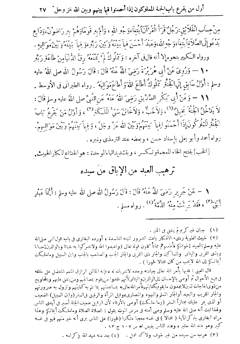 1 - عن جرير رضي الله عنه قال: قال رسول الله صلى الله عليه وسلم: "أيما عبدٍ أبقَ (¬3)، فقد برئت منه الذمة (¬4) " رواه مسلم.