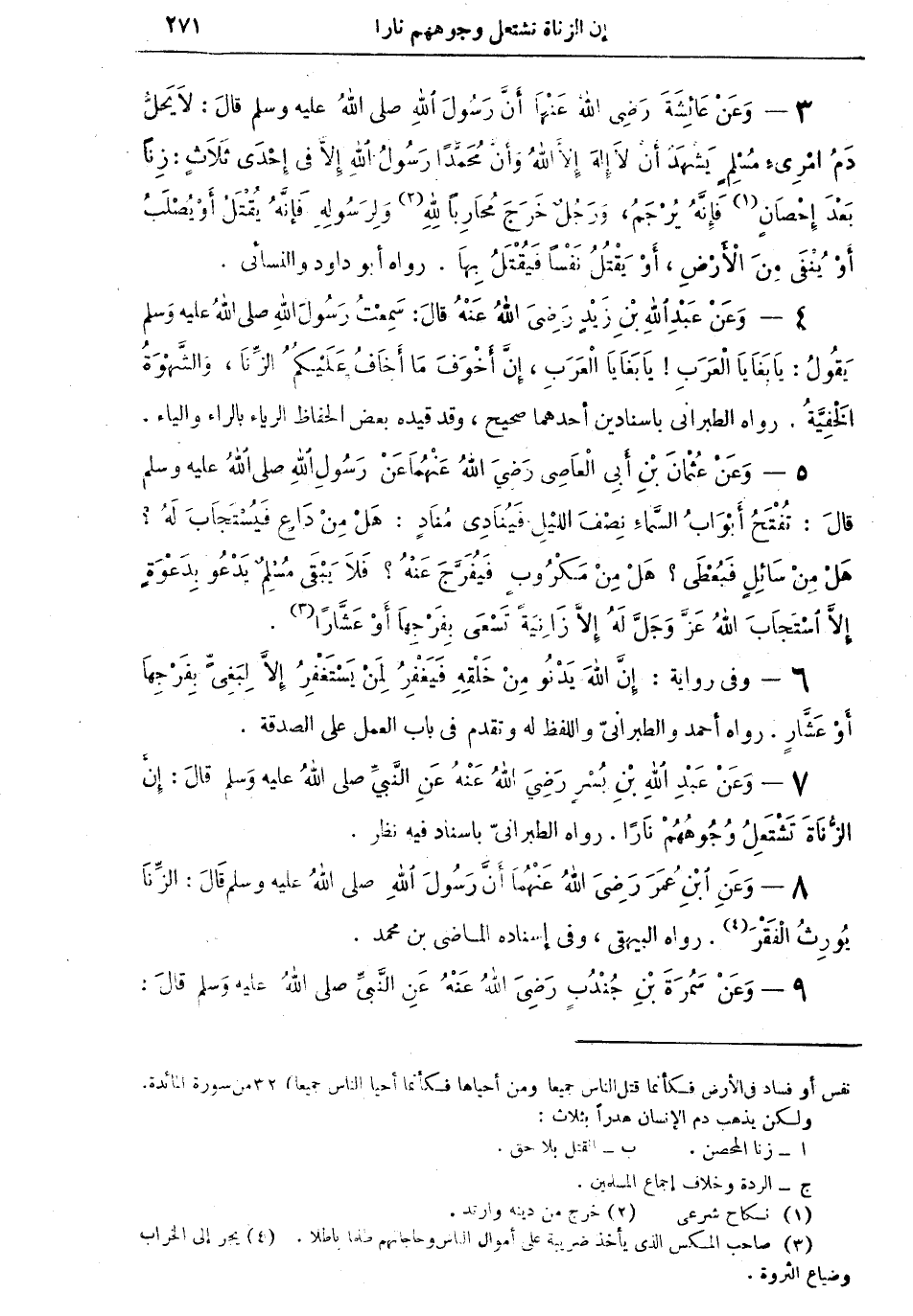3 - وعن عائشة رضي الله عنها أن رسول الله صلى الله عليه وسلم قال: "لا يحل دمُ امرئٍ مسلمٍ يشهدُ أن لا إله إلا اللهُ وأن محمداً رسول الله إلا في إحدى ثلاثٍ: زناً بعد إحصانٍ (¬1) فإنه يُرجمُ، ورجلٌ خرج مُحارباً لله (¬2) ولرسوله فإنه يُقتلُ أو يُصلبُ أو يُنفى من الأرض، أو يَقْتُلُ نفساً فَيُقْتَلُ بها" رواه أبو داود والنسائي.