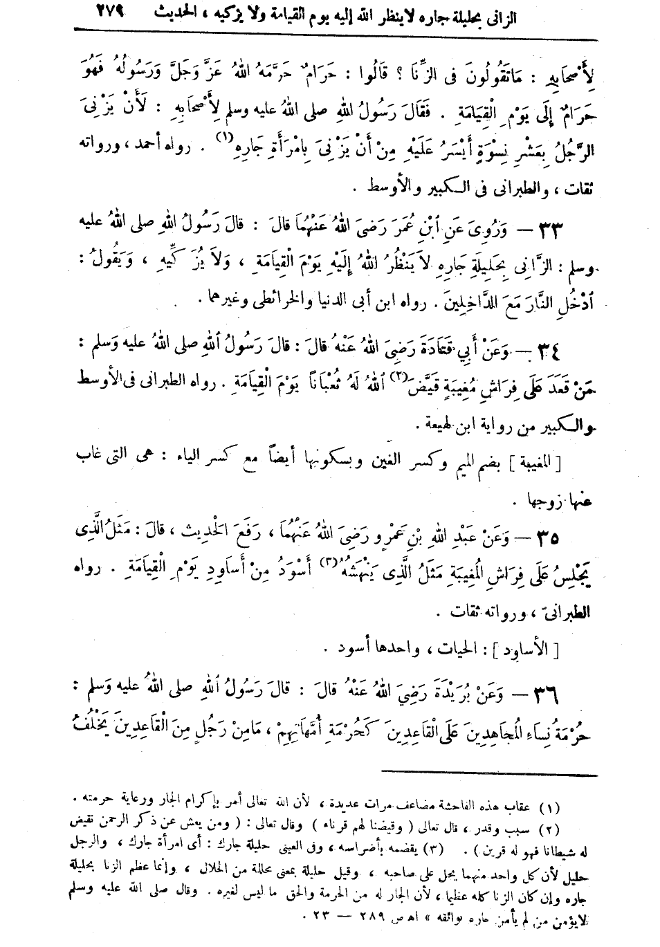 35 - وعن عبد الله بن عمروٍ رضي الله عنهما، رفع الحديث، قال: "مثل الذي يجلسُ على فراش المُغِيبَةِ مثلُ الذي يَنْهَشُهُ (¬3) أسْوَدُ من أسَاوِدِ يوم القيامة" رواه الطبراني، ورواته ثقات.