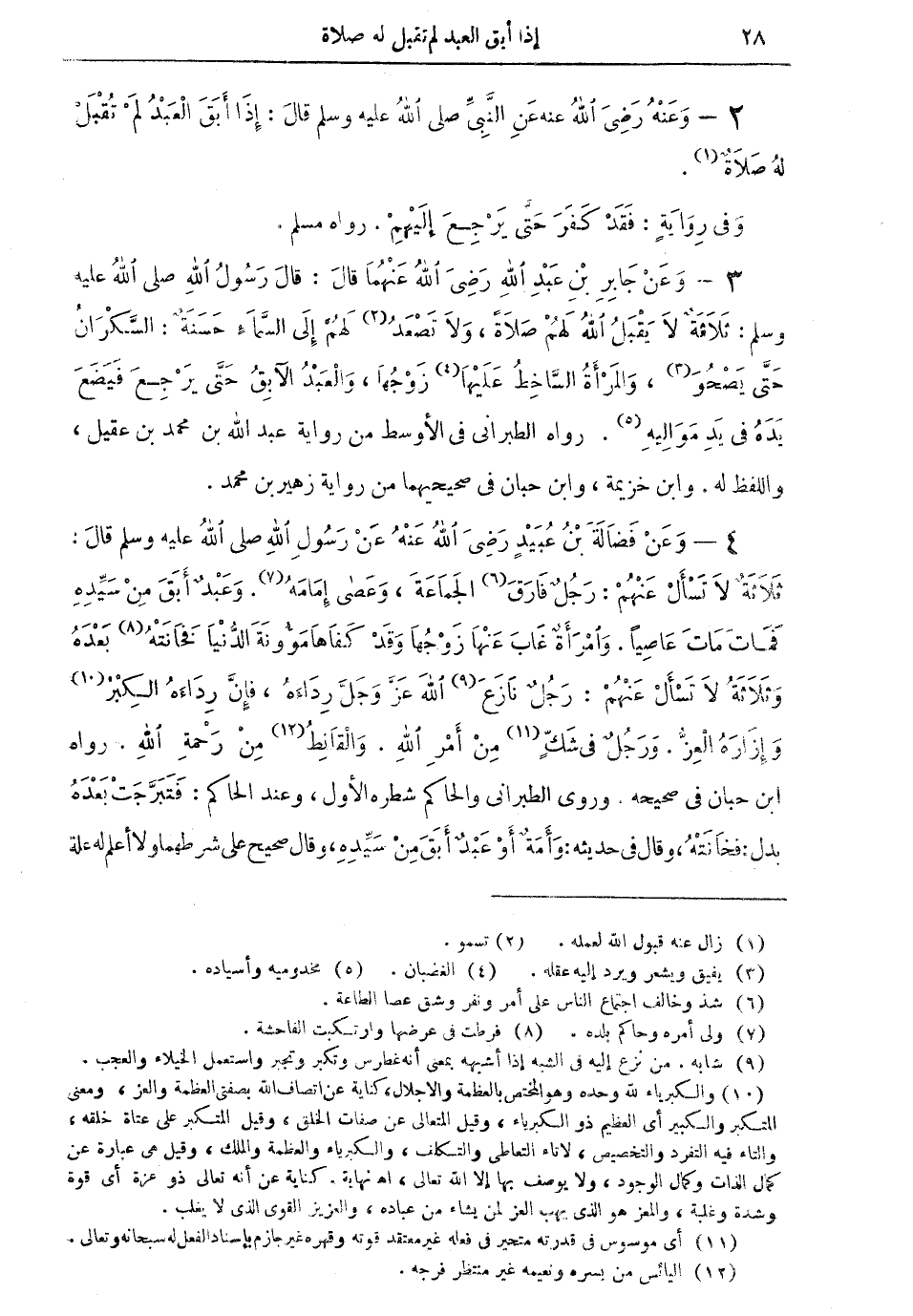 2 - وعنه رضي الله عنه عن النبي صلى الله عليه وسلم قال: "إذا أبق العبدُ لم تُقبل له صلاة (¬1) "، وفي رواية: فقد كفر حتى يرجع إليهم. رواه مسلم.