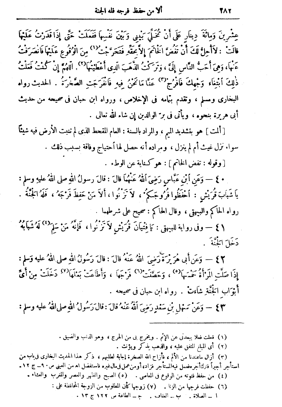 40 - وعن ابن عباس رضي الله عنهما قال: قال رسول الله صلى الله عليه وسلم: "يا شباب قريشٍ: احفظوا فروجكم، لا تزنوا، ألا من حَفِظَ فَرْجَهُ، فله الجنة" رواه الحاكم والبيهقي، وقال الحاكم: صحيح على شرطهما.