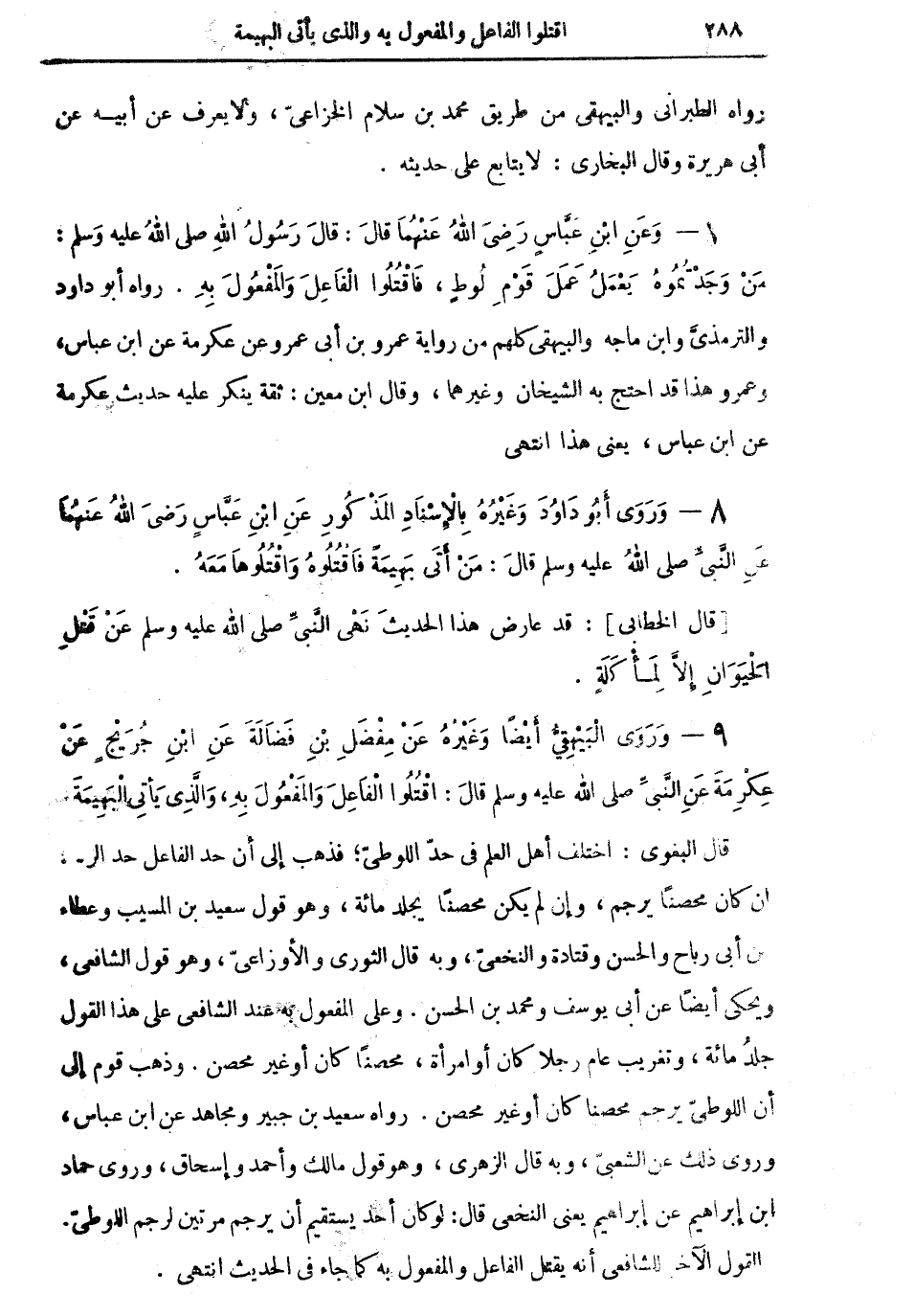 9 - وروى البيهقي أيضاً وغيره عن مِفْضَلِ بن فضالة عن ابن جريرج عن عكرمة عن النبي صلى الله عليه وسلم قال: "اقتلوا الفاعل والمفعول به، والذي يأتي البهيمة".