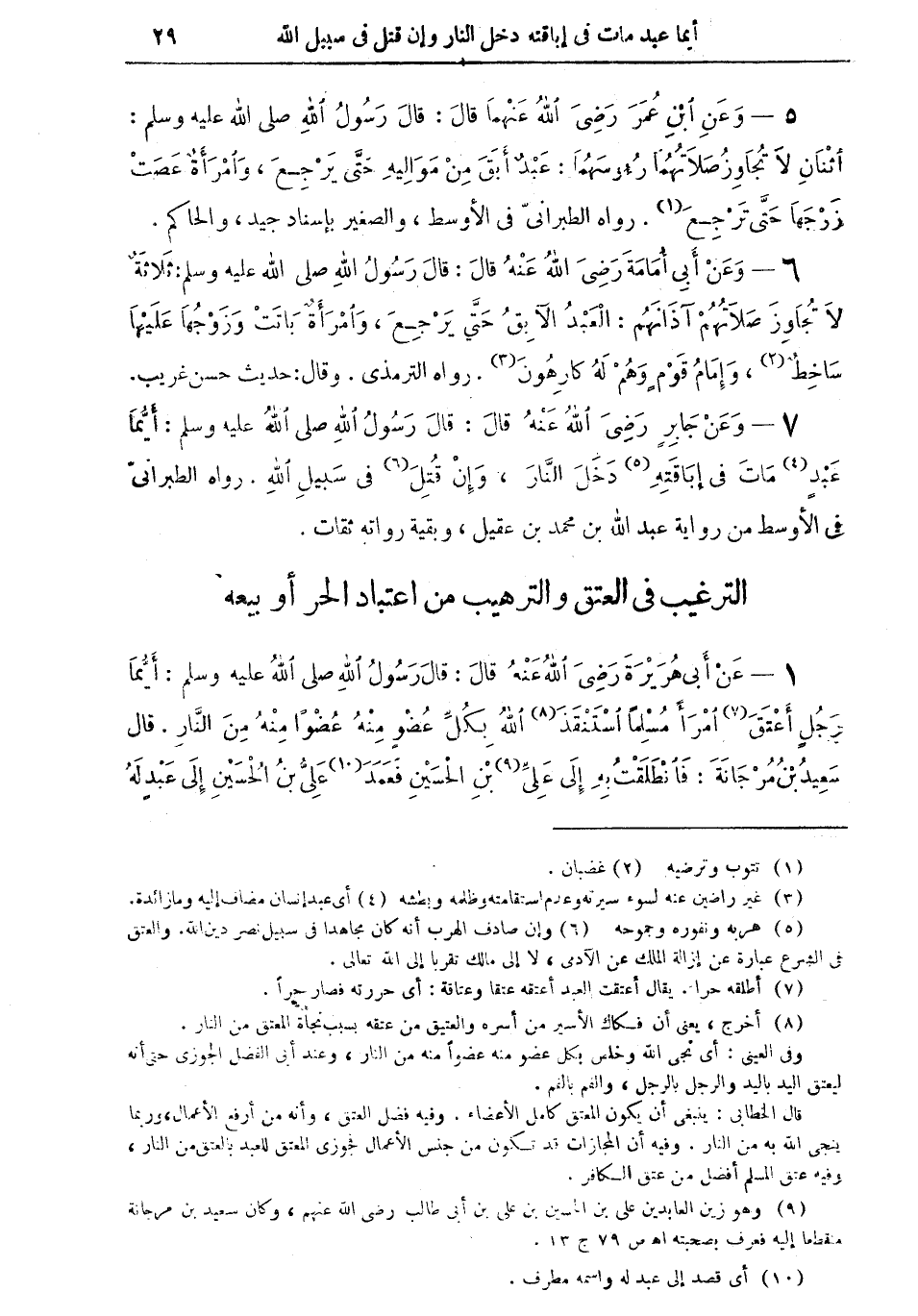 7 - وعن جابر رضي الله عنه قال: قال رسول الله صلى الله عليه وسلم: "أيما عبدٍ (¬4) مات في إباقته (¬5) دخل النار، وإن قتل (¬6) في سبيل الله" رواه الطبراني في الأوسط من رواية عبد الله بن محمد بن عقيل، وبقية رواته ثقات.