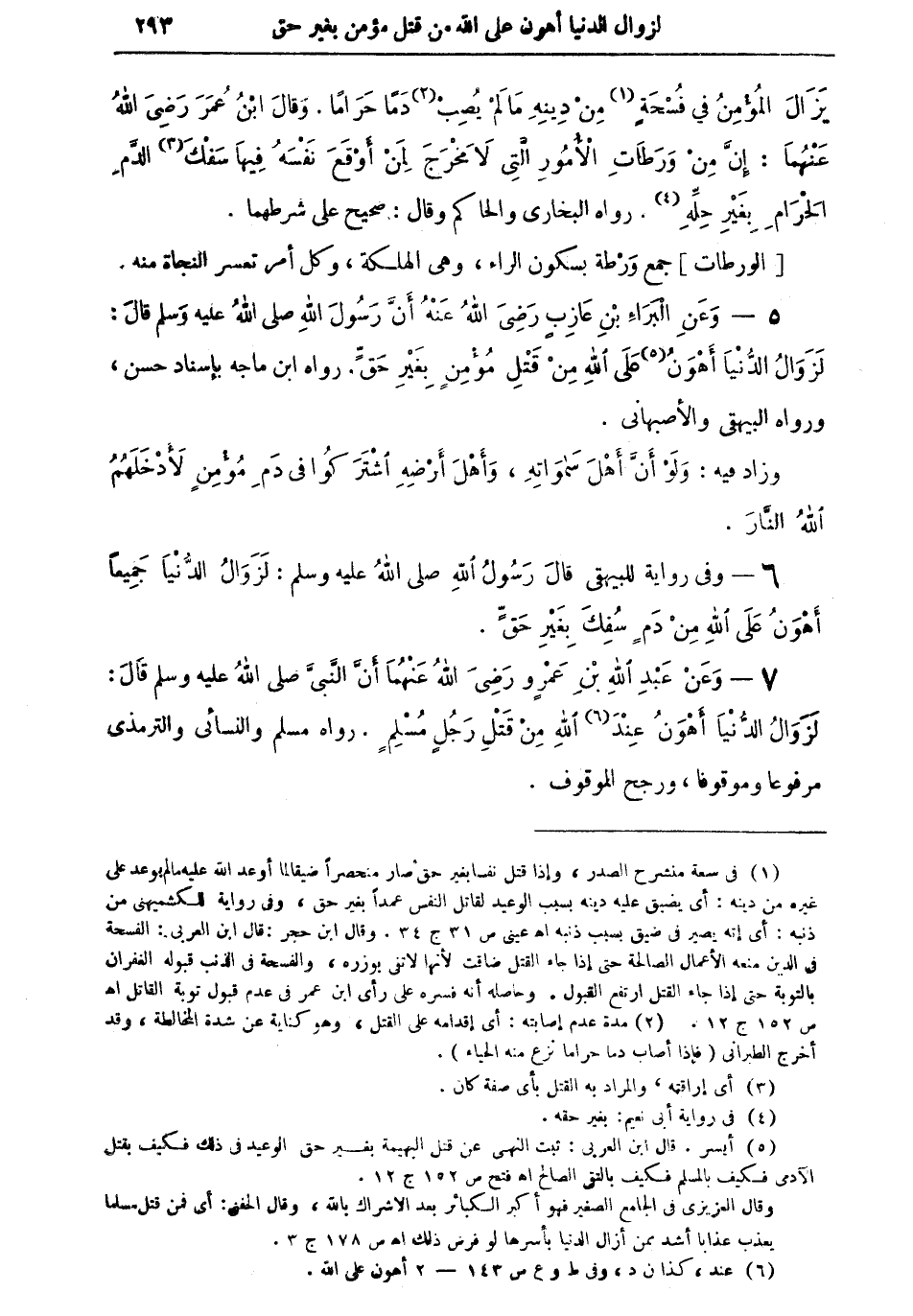 (¬5) أيسر قال ابن العربي: ثبت النهي عن قتل البهيمة بغير حق والوعيد في ذلك فكيف بقتل الآدمي فكيف بالمسلم فكيف بالتقي الصالح. أهـ فتح ص 152 جـ 12، وقال العزيزي: في الجامع الصغير فهو أكبر الكبائر بعد الإشراك بالله، وقال الحفني: أي فمن قتل مسلماً يعذب عذاباً أشد ممن أزال الدنيا بأسرها لو فرض ذلك. أهـ ص 178 جـ 3.