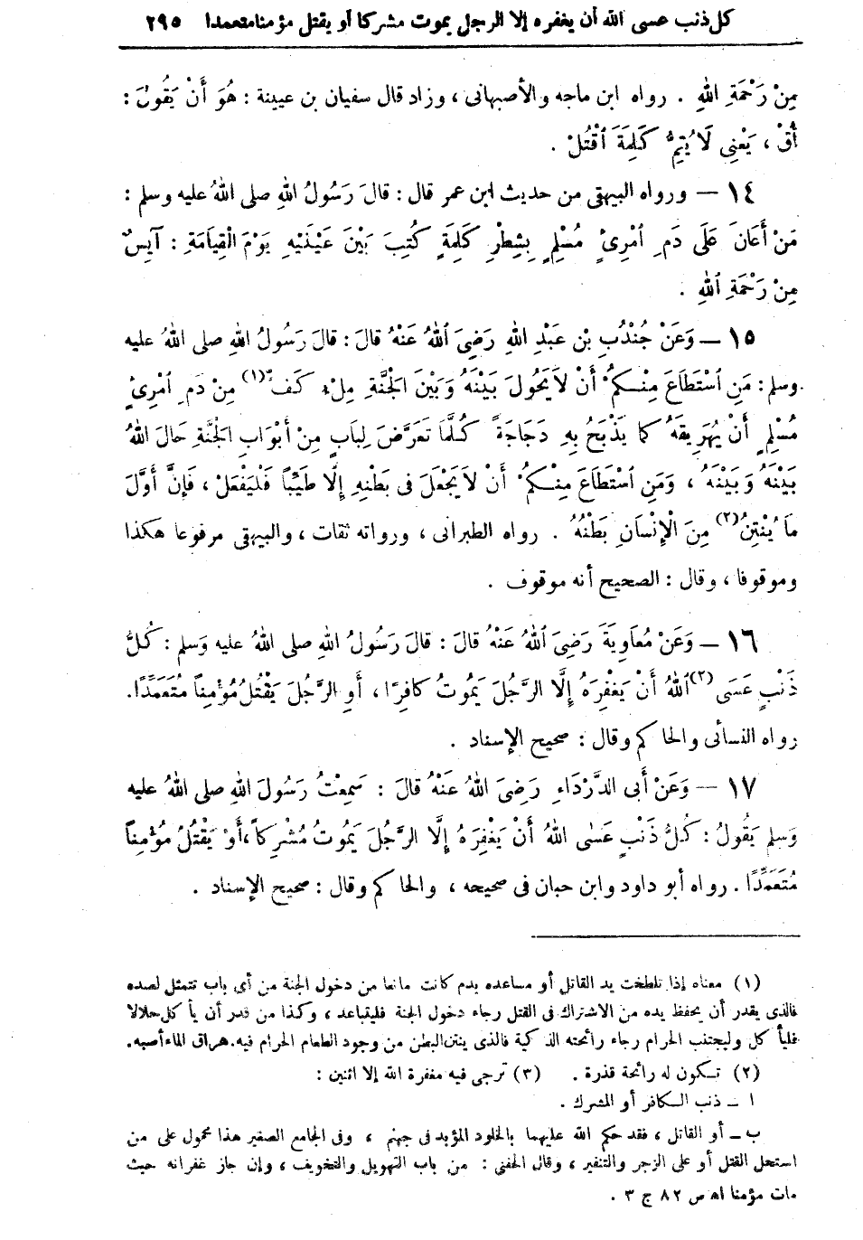 (ب) أو القاتل، فقد حكم الله عليهما بالخلود المؤبد في جهنم، وفي الجامع الصغير هذا محمول على من استحل القتل أو على الزجر والتنفير، وقال الحفني: من باب التهويل والتخويف، وإن جاز غفرانه حيث مات مؤمناً. أهـ. ص 82 جـ 3