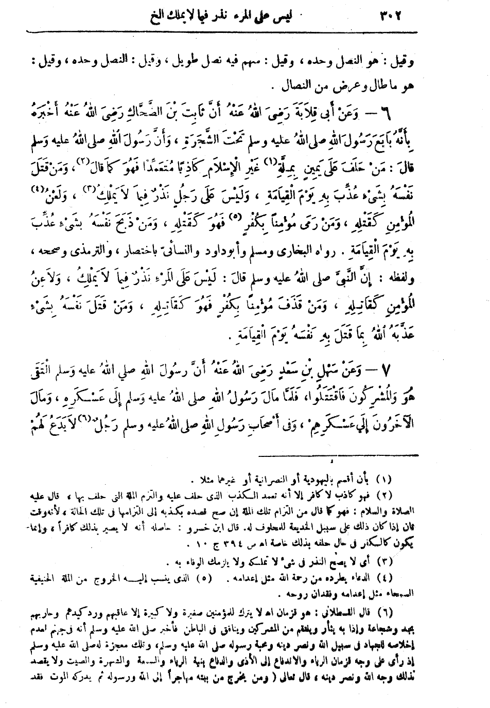 6 - وعن أبي قلابةَ رضي الله عنه أن ثابت بن الضحاك رضي الله عنه أخبره بأنه بايع رسول الله صلى الله عليه وسلم تحت الشجرةِ، وأن رسول الله صلى الله عليه وسلم قال: "من حلف على يمينٍ بِملَّةٍ (¬1) غير الإسلام كاذباً مُتعمداً فهو كما قال (¬2)، ومن قتلَ نفسه بشيءٍ عُذِّبَ به يوم القيامة، وليس على رجلٍ نذرٌ فيما لا يملك (¬3)، وَلَعْنُ (¬4) المؤمنِ كقتله، ومن رَمَى مؤمناً بكفرٍ (¬5) فهو كقتلهِ، ومن ذبح نفسه بشيء عُذِّبَ به يوم القيامة" رواه البخاري ومسلم وأبو داود والنسائي باختصار، والترمذي وصححه، ولفظه: "إن النبي صلى الله عليه وسلم قال: ليس على المرء نذرٌ فيما لا يملكُ، وَلاَعِنُ المؤمن كقاتلهِ، ومن قذف مؤمناً بِكُفْرٍ فهو كقاتلهِ، ومن قتل نفسه بشيء عَذَّبَهُ الله بما قتلَ به نفسهُ يوم القيامة".