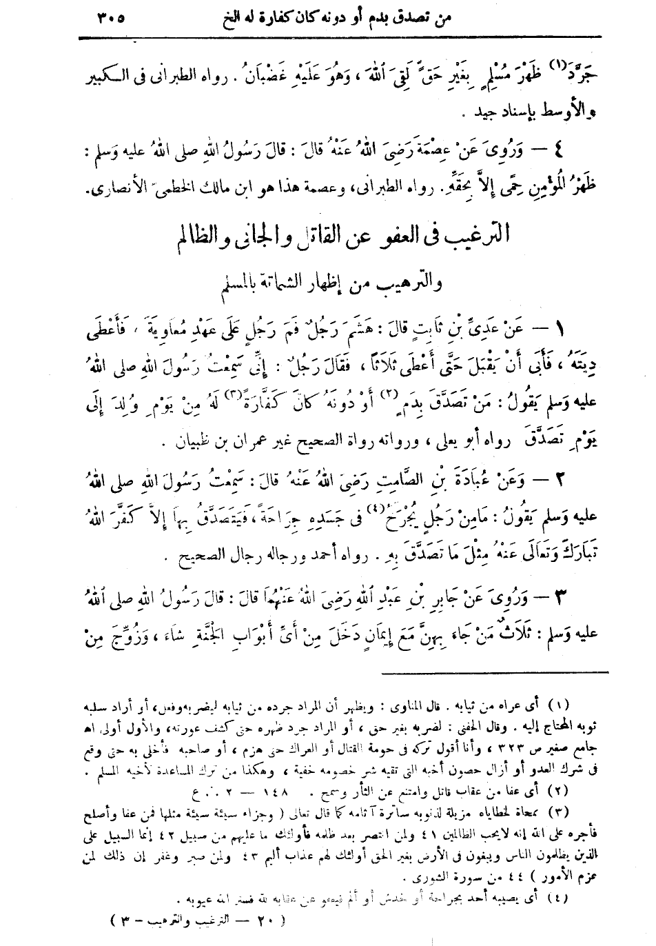 2 - وعن عبادة بن الصامت رضي الله عنه قال: سمعت رسول الله صلى الله عليه وسلم يقول: "ما من رجلٍ يُجْرَحُ (¬4) في جسدهِ جراحةً، فيتصدقُ بها إلا كَفَّرَ الله تبارك وتعالى عنه مِثْلَ ما تصدق به" رواه أحمد ورجاله رجال الصحيح.
