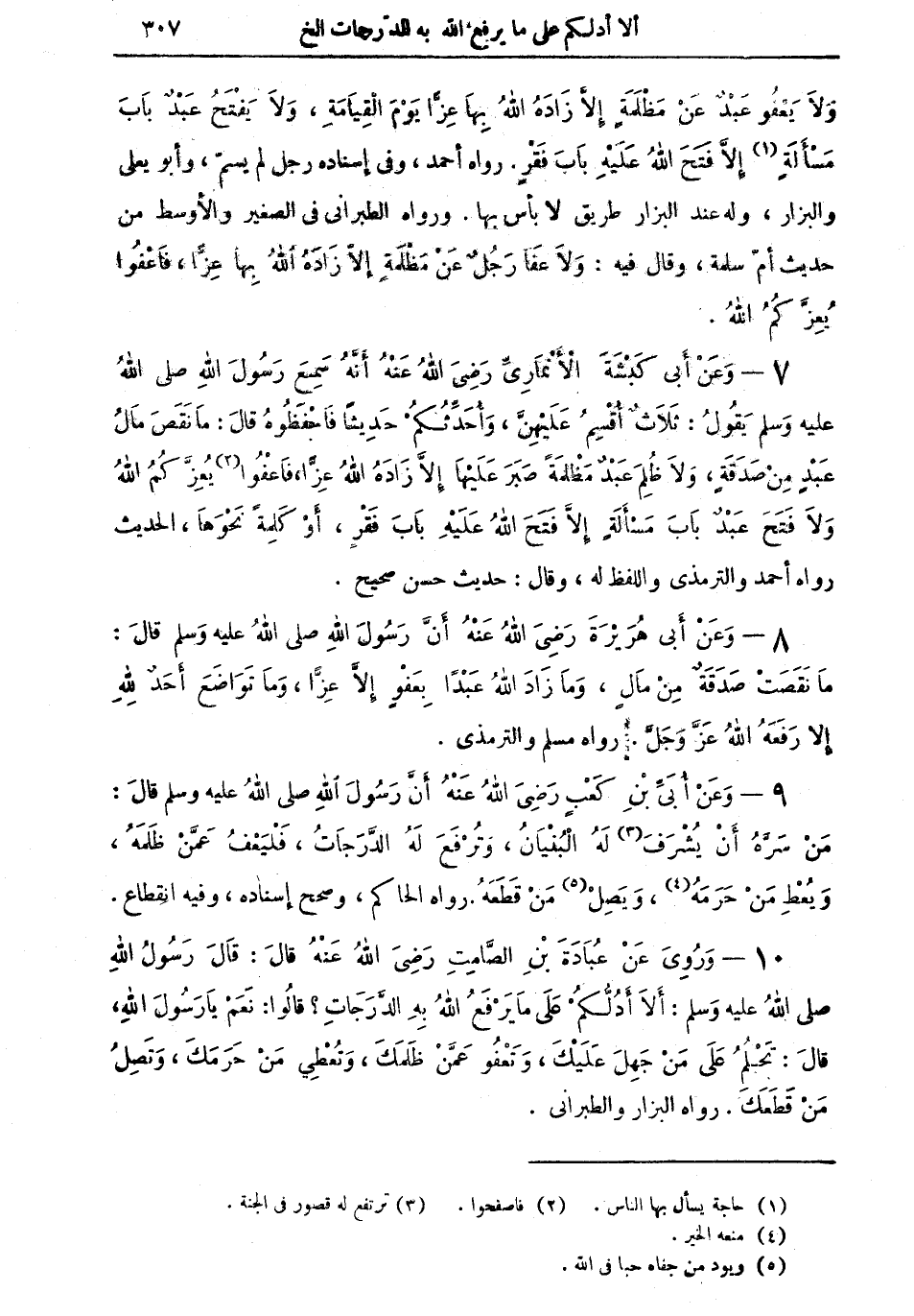 7 - وعن أبي كبشة الأنماري رضي الله عنه أنه سمع رسول الله صلى الله عليه وسلم يقول: "ثلاثٌ أقسمُ عليهنَّ، وأحدِّثُكمْ حديثاً فاحفظوه قال: ما نقص مالُ عبدٍ من صدقةٍ، ولا ظُلمَ عبدٌ مظلمةً صبر عليها إلا زاده الله عزاً، فاعفوا (¬2) يُعزكمُ الله ولا فتح عبد باب مسألةٍ إلا فتح الله عليه باب فقرٍ، أو كلمة نحوها" الحديث رواه أحمد والترمذي واللفظ له، وقال: حديث حسن صحيح.