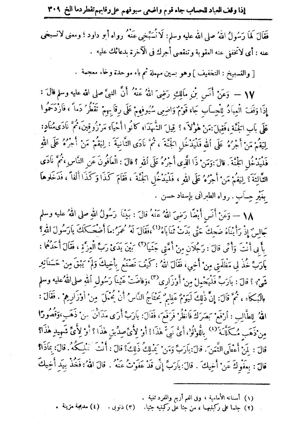 17 - وعن أنس بن مالكٍ رضي الله عنه أن النبي صلى الله عليه وسلم قال: "إذا وقف العبادُ للحساب جاء قومٌ واضعي سيوفهم على رقابهم تقطرُ دماً، فازدحموا على باب الجنة، فقيل: من هؤلاء؟ قيل الشهداء كانوا أحياءً مرزوقين، ثم نادى مُنادٍ: لِيَقُمْ مَنْ أجْرُهُ على الله فليدخلِ الجنة، ثم نادى الثانية: ليقم من أجره على الله فليدخل الجنة. قال: ومن ذا الذي أجره على الله؟ قال العافون عن الناس، ثم نادى الثالثة؟ ليقم من أجره على الله، فليدخل الجنة، فقام كذا وكذا ألفاً، فدخلوها بغير حساب" رواه الطبراني بإسناد حسن.