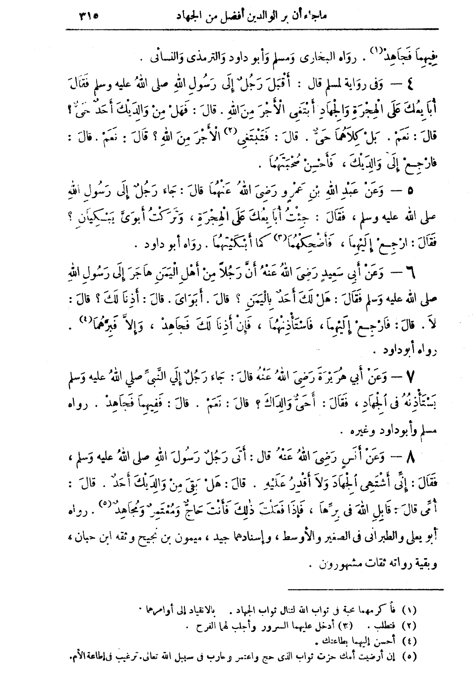 (¬5) إن أرضيت أمك حزت ثواب الذي حج واعتمر وحارب في سبيل الله تعالى. ترغيب في إطاعة الأم.