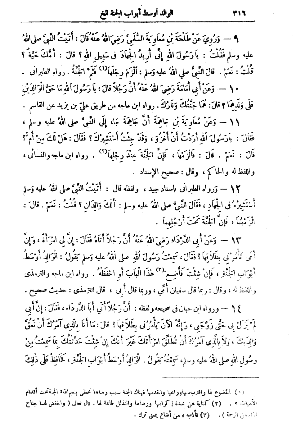 9 - ورويَ عن طلحةَ بن معاويةَ السُّلَمِيِّ رضي الله عنه قال: "أتيتُ النبي صلى الله عليه وسلم فقلتُ: يا رسول الله إني أُريدُ الجهاد في سبيل الله؟ قال: أُمُّكَ حَيَّةٌ؟ قلتُ: نعم. قال النبي صلى الله عليه وسلم: الزم رِجْلَهَا (¬1) فَثَمَّ الجنةُ" رواه الطبراني.