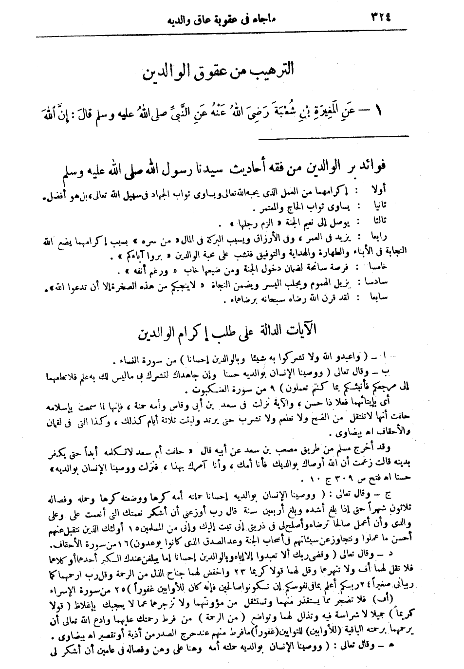 (د) وقال تعالى: "وقضى ربك ألا تعبدوا إلا إياه وبالوالدين إحساناً إما يبلغن عندك الكبر أحدهما أو كلاهما فلا تقل لهما أفٍ ولا تنهرهما وقل لهما قولاً كريماً واخفض لهما جناح الذل من الرحمة وقل رب ارحمهما كما ربياني صغيراً ربكم أعلم بما في نفوسكم إن تكونوا صالحين فإنه كان للأوابين غفوراً" (23 - 25 من سورة الإسراء). (أف): فلا تضجر مما يستقذر منهما وتستثقل من مؤونتهما ولا تزجرهما عما لا يعجبك بإغلاظ (قولاً كريماً): جميلاً لا شراسة فيه وتذلل لهما وتواضع (من الرحمة): من فرط رحمتك عليهما وادع الله تعالى أن يرحمهما برحمته الباقية (للأوابين): للتوابين (غفوراً): ما فرط منهم عند حرج الصدر من أذية أو تقصير. أهـ بيضاوي.