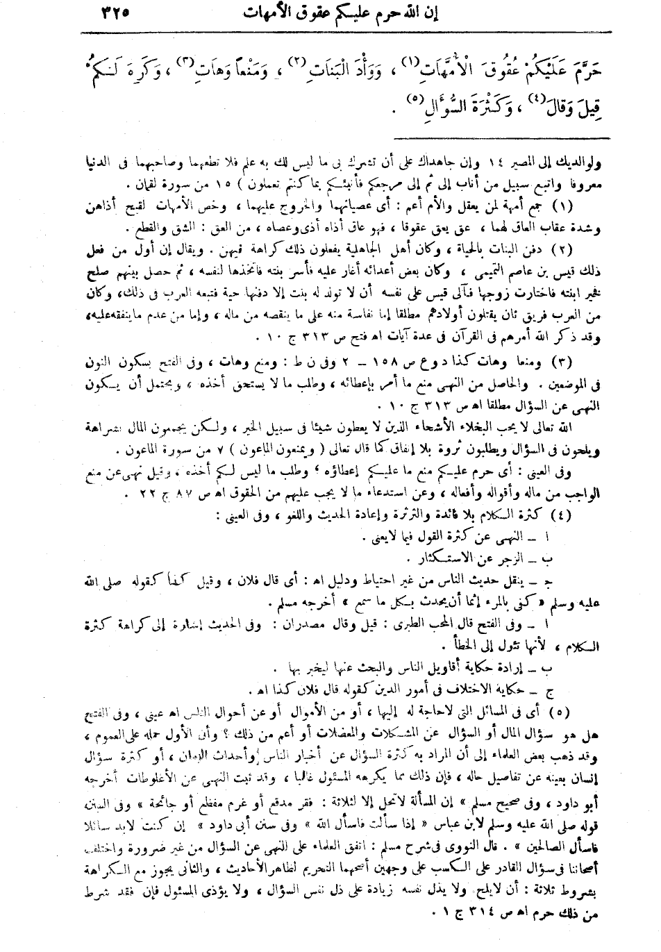 (¬3) ومنعاً وهات كذا (د وع ص 158 - 2)، وفي (ن ط): ومنع وهات، وفي الفتح بسكون النون في الموضعين، والحاصل من النهي منع ما أمر بإعطائه، وطلب ما لا يستحق أخذه، ويحتمل أن يكون النهي عن السؤال مطلقاً. أهـ ص 313 جـ 10، الله تعالى لا يحب البخلاء الأشحاء الذين لا يعطون شيئاً في سبيل الخير، ولكن يجمعون المال بشراهة ويلحون في السؤال ويطلبون ثروة بلا إنفاق كما قال تعالى: "ويمنعون الماعون" (7 من سورة الماعون)، وفي العيني: أي حرم عليكم منع ما عليكم إعطاؤه، وطلب ما ليس لكم أخذه، وقيل نهى عن منع الواجب من ماله وأقواله وأفعاله، وعن استدعاء ما لا يجب عليهم من الحقوق. أهـ ص 87 جـ 22