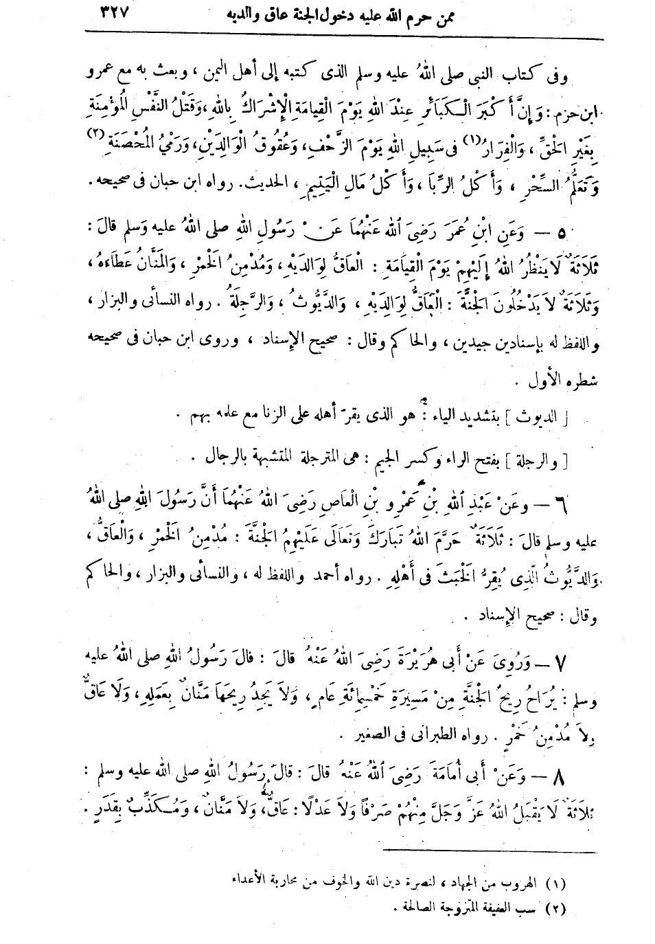 6 - وعن عبد الله بن عمرو بن العاص رضي الله عنهما أن رسول الله صلى الله عليه وسلم قال: "ثلاثةٌ حَرَّمَ الله تبارك وتعالى عليهمُ الجنة: مدمن الخمر، والعاقُّ، والديوثُ الذي يقر الْخَبَثَ في أهله" رواه أحمد واللفظ له، والنسائي والبزار والحاكم، وقال: صحيح الإسناد.