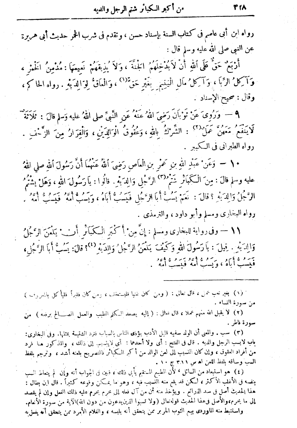 10 - وعن عبد الله بن عمرو بن العاص رضي الله عنهما أن رسول الله صلى الله عليه وسلم قال: "من الكبائر شَتْمُ (¬3) الرجلِ والديهِ. قالوا: يا رسول الله وهلْ يشتمُ الرجلُ والديه؟ قال: نعم يَسُبُّ أبا الرجلِ فيسبُّ أباهُ، ويسبُّ أمهُ" رواه البخاري ومسلم وأبو داود والترمذي.