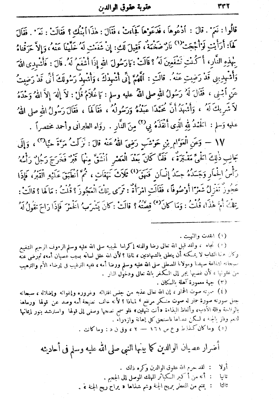 (¬2) نجاه، ولقد قبل الله تعالى رضا والدته إكراماً لحبيبه صلى الله عليه وسلم الرءوف الرحيم الشفيع، وكان هذا الشاب لا يمكنه أن ينطق بالشهادتين، لماذا؟ لأن الله عقل لسانه بسبب عصيان أمه، ثم رضي عنه سبحانه لشفاعة سيدنا ومولانا المصطفى صلى الله عليه وسلم ورضا أمه، ففيه الترغيب في إرضاء الأم والترهيب من عقوقها، لأن غضبها يجر إلى الكفر بالله تعالى ودخول النار.