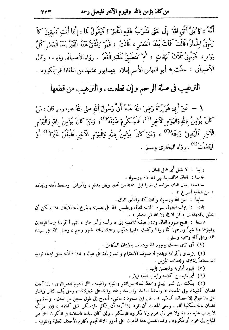 1 - عن أبي هريرة رضي الله عنه أن رسول الله صلى الله عليه وسلم قال: "من كان يؤمن بالله واليوم الآخر (¬1)، فَلْيُكْرِمْ ضَيفهُ (¬2)، ومن كان يؤمن بالله واليوم الآخر فَلْيَصِلْ رَحِمَهُ (¬3)، ومن كان يؤمن بالله واليوم الآخر فليقل خيراً (¬4) أو ليصمت (¬5) " رواه البخاري ومسلم.