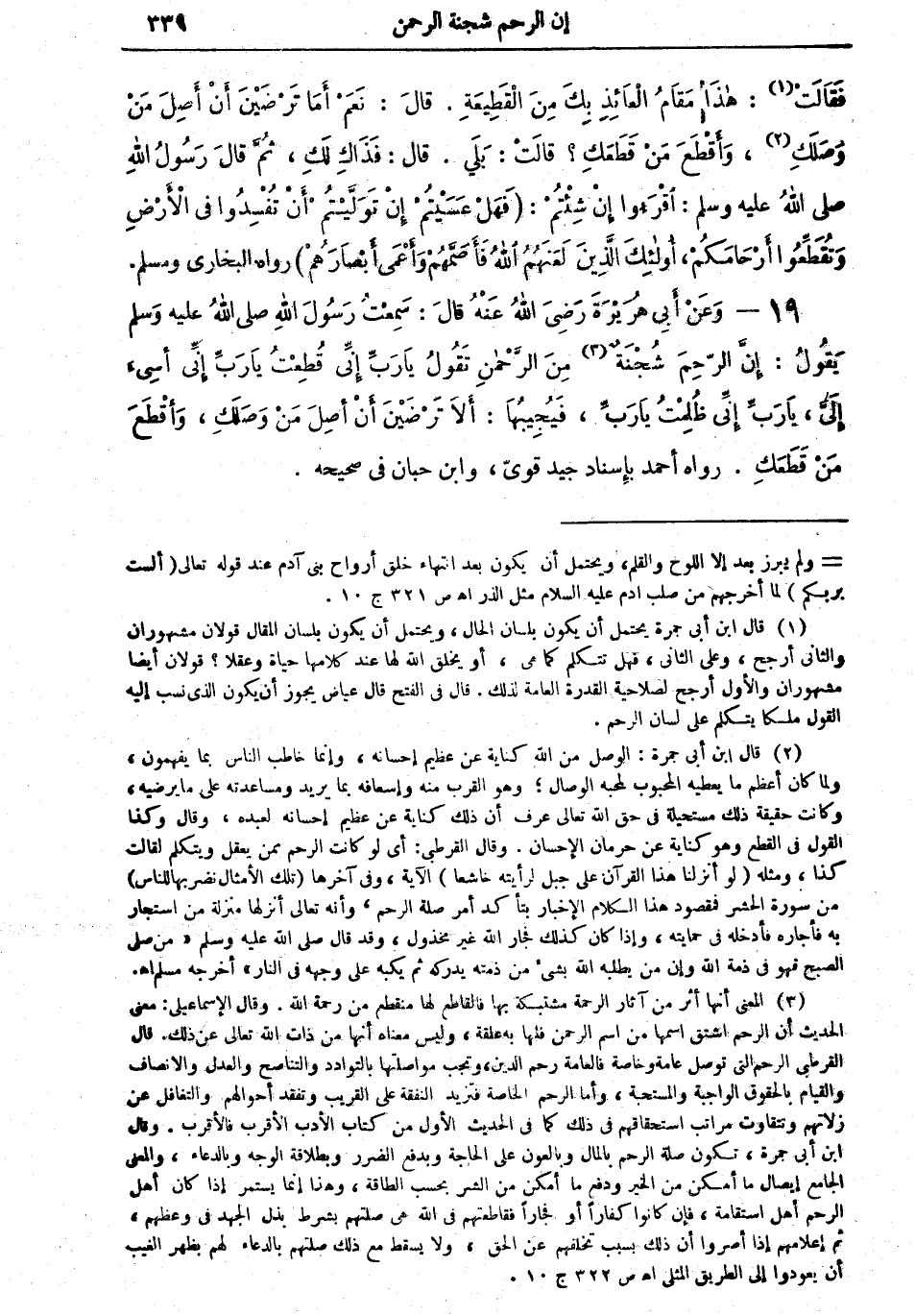 (¬3) المعنى أنها أثر من آثار الرحمة مشتبكة بها فالقاطع لها منقطع من رحمة الله. وقال الإسماعيلي: معنى الحديث أن الرحم اشتق اسمها من اسم الرحمن فلها به علقة، وليس معناه أنها من ذات الله، تعالى عن ذلك، قال القرطبي: الرحم التي توصل عامة وخاصة فالعامة رحم الدين، وتجب مواصلتها بالتوادد والتناصح والعدل والإنصاف والقيام بالحقوق الواجبة والمستحبة، وأما الرحم الخاصة فتزيد النفقة على القريب وتفقد أحوالهم والتغافل عن زلاتهم وتتفاوت مراتب استحقاقهم في ذلك كما في الحديث الأول من كتاب الأدب الأقرب فالأقرب. وقال ابن أبي جمرة: تكون صلة الرحم بالمال وبالعون على الحاجة وبدفع الضرر وبطلاقة الوجه وبالدعاء، والمعنى الجامع إيصال ما أمكن من الخير ودفع ما أمكن من الشر بحسب الطاقة، وهذا إنما يستمر إذا كان أهل الرحم أهل استقامة، فإن كانوا كفاراً أو فجاراً فمقاطعتهم في الله هي صلتهم بشرط بذل الجهد في وعظهم، ثم إعلامهم إذا أصروا أن ذلك بسبب تخلفهم عن الحق، ولا يسقط مع ذلك صلتهم بالدعاء لهم بظهر الغيب أن يعودوا إلى الطريق المثلى. أهـ ص 322 جـ 10.