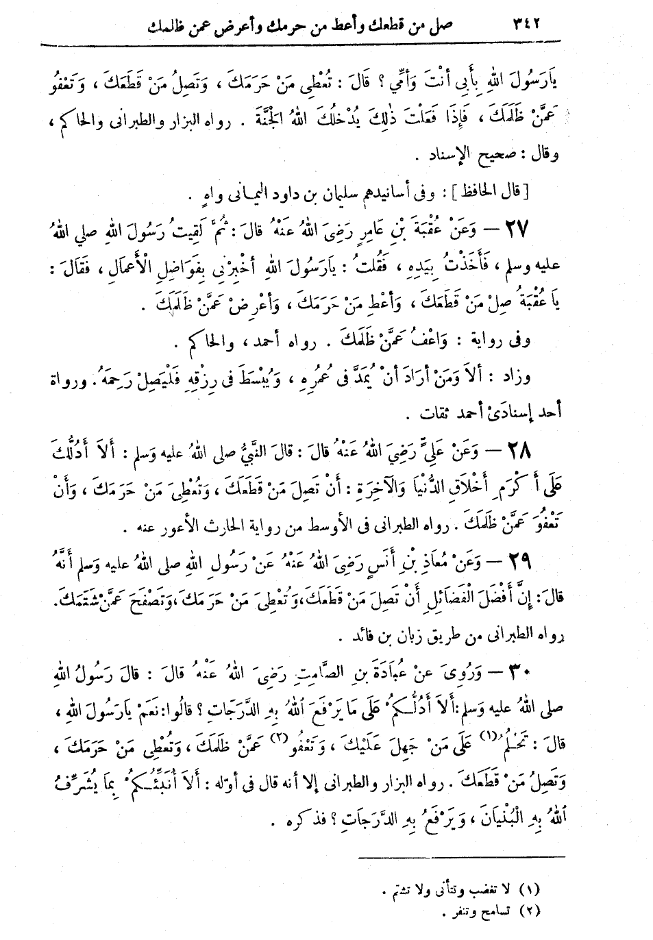 27 - وعن عقبة بن عامر رضي الله عنه قال: "ثم لَقِيتُ رسول الله صلى الله عليه وسلم ن فأخذتُ بيده، فقلتُ يا رسول الله: أخبرني بفواضلِ الأعمال، فقال: يا عقبة صِلْ من قطعكَ، وأعطِ من حرمكَ، وأعرضْ عمن ظلمكَ" وفي رواية: "واعف عمن ظلمك" رواه أحمد، والحاكم. وزاد: "ألا ومن أراد أن يُمَدَّ في عُمُرِهِ، وَيُبْسَطَ في رزقه فليصل رحمهُ" ورواة أحد إسنادي أحمد ثقات.