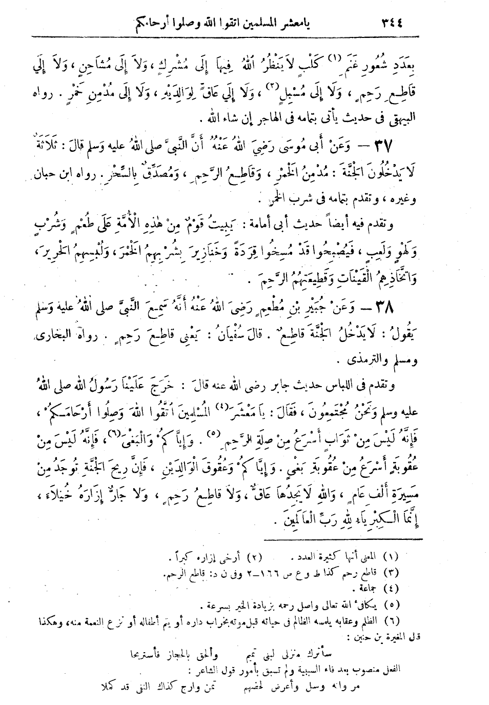 38 - وعن جبير بن مُطعمٍ رضي الله عنه أنه سمع النبي صلى الله عليه وسلم يقول: "لا يدخلُ الجنة قاطعٌ. قال سفيان: يعني قاطع رحمٍ (¬3) " رواه البخاري ومسلم والترمذي.