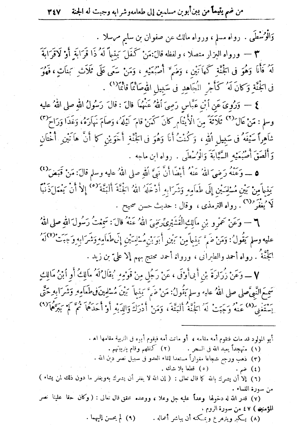 6 - وعن عمرو بن مالكِ القشيري رضي الله عنه قال: سمعت رسول الله صلى الله عليه وسلم يقول: "ومن ضَمَّ يتيماً من بين أبوين مسلمين إلى طعامه وشرابه وجبت (¬7) له الجنة" رواه أحمد والطبراني، ورواة أحمد محتج بهم إلا علي بن زيد.