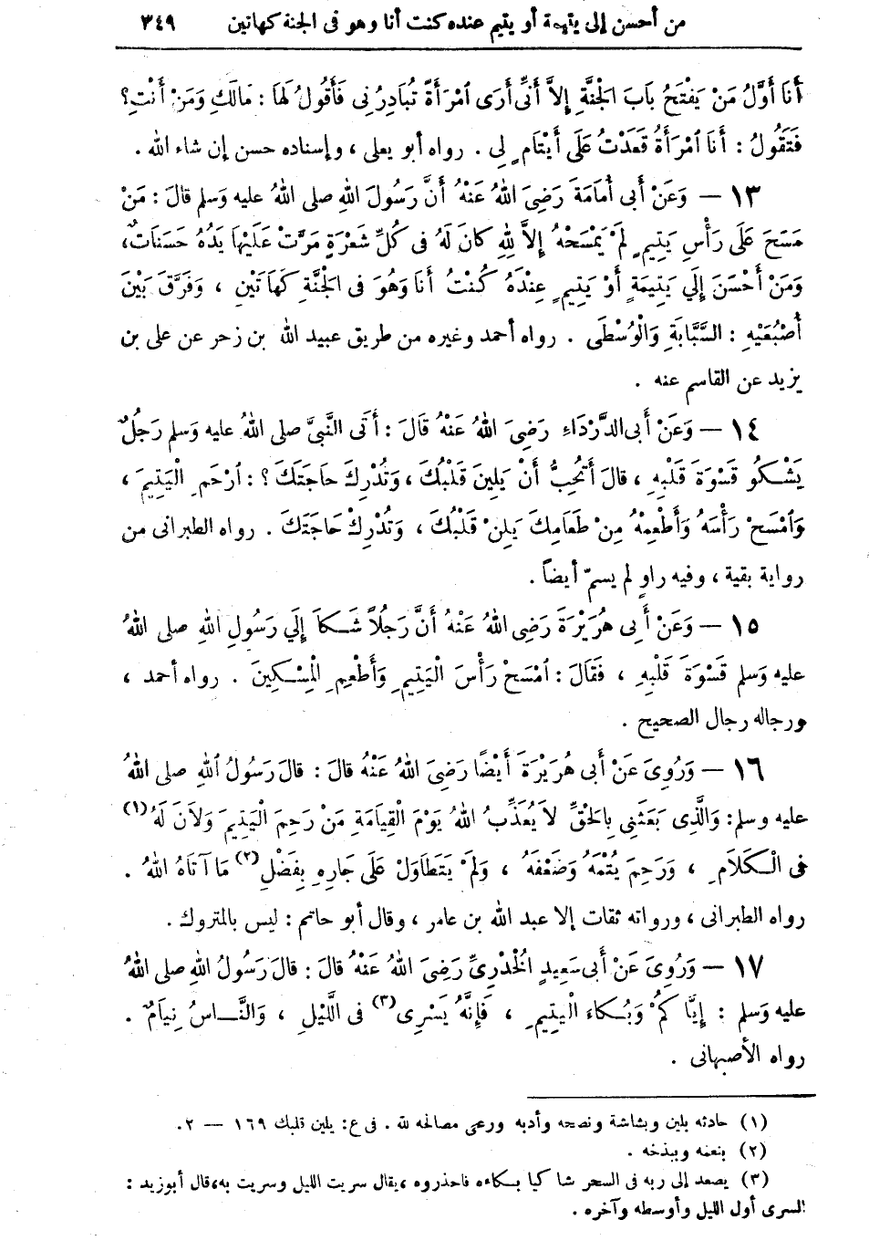 13 - وعن أبي أمامة رضي الله عنه أن رسول الله صلى الله عليه وسلم قال: "من مسح على رأس يتيمٍ لم يمسحهُ إلا لله كان له في كل شعرةٍ مَرَّت عليها يدهُ حسناتٌ، ومن أحسنَ إلى يتيمةٍ أو يتيمٍ عنده كنت أنا وهو في الجنة كهاتين، وفَرَّقَ بين أصبعيه: السبابة والوسطى" رواه أحمد وغيره من طريق عبيد الله بن زحر عن علي ابن يزيد عن القاسم عنه.
