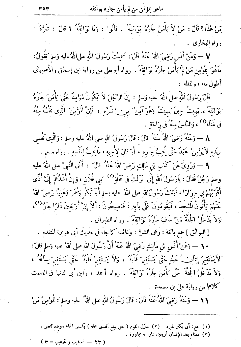 7 - وعن أنسٍ رضي الله عنه قال: سمعتُ رسول الله صلى الله عليه وسلم يقول: "ما هو بمؤمنٍ من لم يأمن جارهُ بوائقهُ" رواه أبو يعلى من رواية ابن إسحاق والأصبهاني أطول منه، ولفظه: "قال رسول الله صلى الله عليه وسلم: إن الرجل لا يكونُ مؤمناً حتى يأمن جارهُ بوائقهُ، يبيتُ حين يبيتُ وهو آمنٌ من شَرِّهِ، فإن المؤمن الذي نفسهُ منه في غناء (¬1)، والناسُ منهُ في راحةٍ".