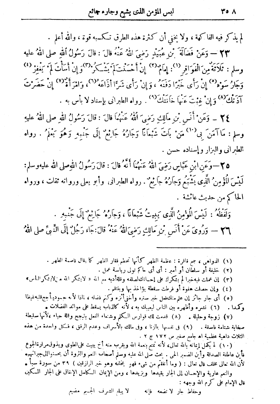 (¬10) لم يكمل إيمانه بالله تعالى، لأنه تمتع بنعمة الله وبقرب منه أخ يبيت على الطوى ويذوق مرارة الجوع، فأين عاطفة الصدقة وأين الضمير الحي، يحث صلى الله عليه وسلم أصحاب النعم والثروة أن يحسنوا إلى جيرانهم، لأن الله تعالى مخلف، قال تعالى: "وما أنفقتم من شيء فهو يخلفه وهو خير الرازقين" (39 من سورة سبأ). والنعم عارية والإحسان إلى الجار يقيدها ويزيدها، ومن الإيمان الكامل الإنفاق على الجار المسكين، قال الإمام علي كرم الله وجهه: