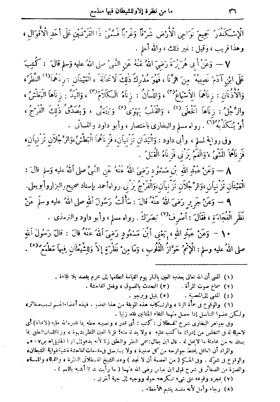 (¬6) والوقوع في حمأة الزنا، وارتكاب هذه الموبقة من هذا العضو، فهذه أعضاء الجسم تسبب صغائر، ولكن عضوا التناسل إذا حصل منهما التقاء الختانين فقد زنيا. وفي جواهر البخاري شرح القسطلاني: كتب: أي قدر، ونصيبه حظه بما قدره الله عليه (لا محالة) أي لا حيلة له في التخلص من إدراك ما كتب عليه، ولابد له منه فزنا العين النظر بشهوة، وزنا اللسان النطق بما يستلذ به من محادثة ما لا يحل له، قال ابن بطال سمى النظر والنطق زنا لأنه يدعو إلى الزنا الحقيقي. أ. هـ. ص 507، والمراد أن العاقل يحفظ جوارحه من كل صغيرة، ولا يسترسل في مقدمات الفاحشة خشية غواية الشيطان، والوقوع في شركه، وفي الحكم (من العصمة أن لا تجد) وعد الشيخ القسطلاني النظرة، والقبلة، واللمسة، والغمزة من الصغائر في شرح قول ابن عباس رضي الله عنهما (ما رأيت شيئاً أشبه باللمم).