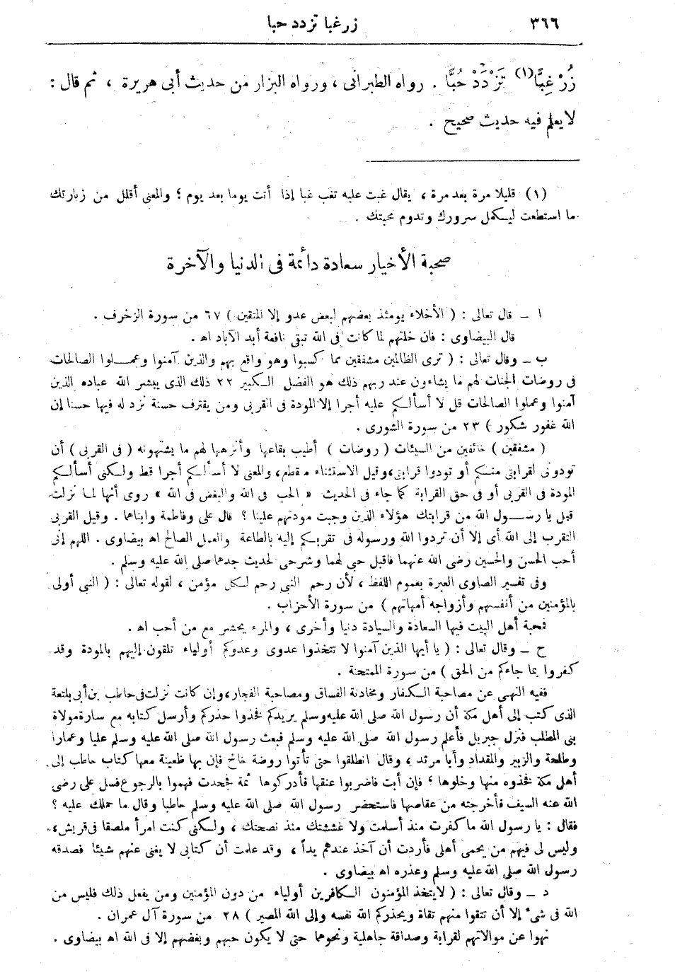 (ب) وقال تعالى: "ترى الظالمين مشفقين مما كسبوا وهو واقع بهم والذين آمنوا وعملوا الصالحات في روضات الجنات لهم ما يشاءون عند ربهم ذلك هو الفضل الكبير ذلك الذي يبشر الله عباده الذين آمنوا وعملوا الصالحات قل لا أسألكم عليه أجراً إلا المودة في القربى ومن يقترف حسنةً نزد له فيها حسناً إن الله غفور شكور" (22 - 23 من سورة الشورى). (مشفقين): خائفين من السيئات (روضات): أطيب بقاعها وأنزهها لهم ما يشتهونه (في القربى): أن تودوني لقرابتي منكم أو تودوا قرابتي، وقيل الاستثناء منقطع، والمعنى لا أسألكم أجراً قط ولكني أسألكم المودة في القربى أو في حق القرابة كما جاء في الحديث "الحب في الله والبغض في الله" روى أنها لما نزلت قيل يا رسول الله من قرابتك هؤلاء الذين وجبت مودتهم علينا. قال: علي وفاطمة وأبناءهما. وقيل القربى التقرب إلى الله أي إلا أن تودوا الله ورسوله في تقربكم إليه بالطاعة والعمل الصالح. أهـ بيضاوي. اللهم إني أحب الحسن والحسين رضي الله عنهما فاقبل حبي لهما وشرحي لحديث جدهما صلى الله عليه وسلم. وفي تفسير الصاوي العبرة بعموم اللفظ، لأن رحم النبي رحم لكل مؤمن، لقوله تعالى: "النبي أولى بالمؤمنين من أنفسهم وأزواجه أمهاتهم" (من سورة الأحزاب). فمحبة أهل البيت فيها السعادة والسيادة دنيا وأخرى، والمرء يحشر مع من أحب. أهـ.