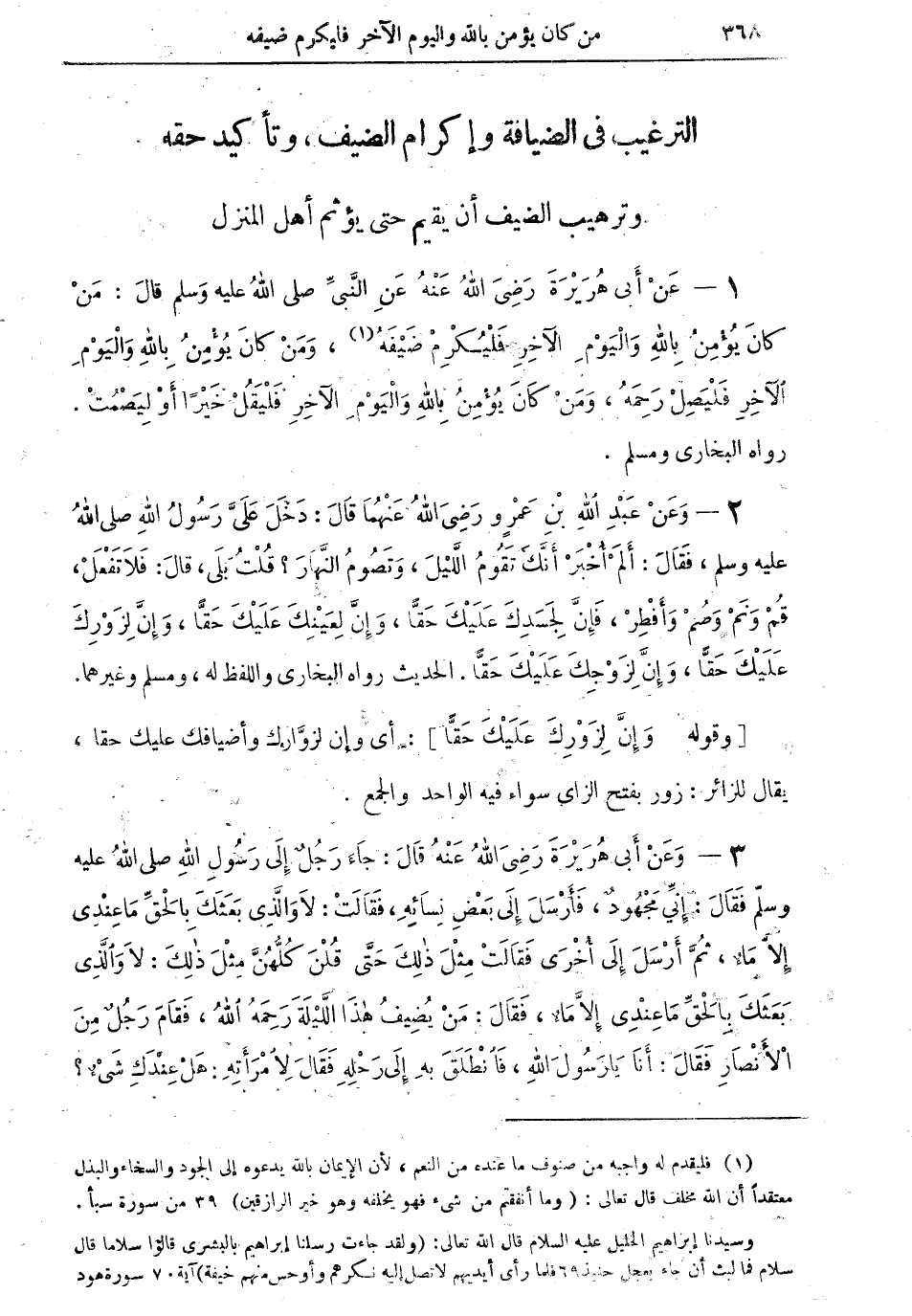 (¬1) فليقدم له واجبه من صنوف ما عنده من النعم، لأن الإيمان بالله يدعوه إلى الجود والسخاء والبذل معتقداً أن الله مخلف قال تعالى: "وما أنفقتم من شيء فهو يخلفه وهو خير الرازقين" (39 من سورة سبأ). وسيدنا إبراهيم الخليل عليه السلام، قال الله تعالى: "ولقد جاءت رسلنا إبراهيم بالبشرى قالوا سلاما قال سلام فما لبث أن جاء بعجل حنيذ فلما رأى أيديهم لا تصل إليه نكرهم وأوجس منهم خيفة" (من سورة هود).