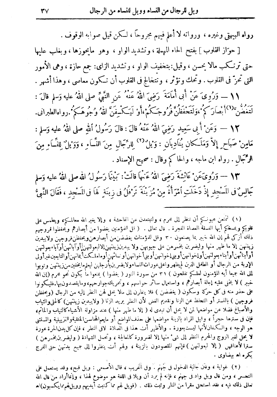 12 - وعن أبي سعيد رضي الله عنه عن النبي صلى الله عليه وسلم: "ما من صباح إلا وَمَلَكَانِ يُنَاديانِ: ويلٌ (¬2) للرجال من النساء، وويلٌ للنساء من الرجال" رواه ابن ماجة، والحاكم وقال صحيح الإسناد.