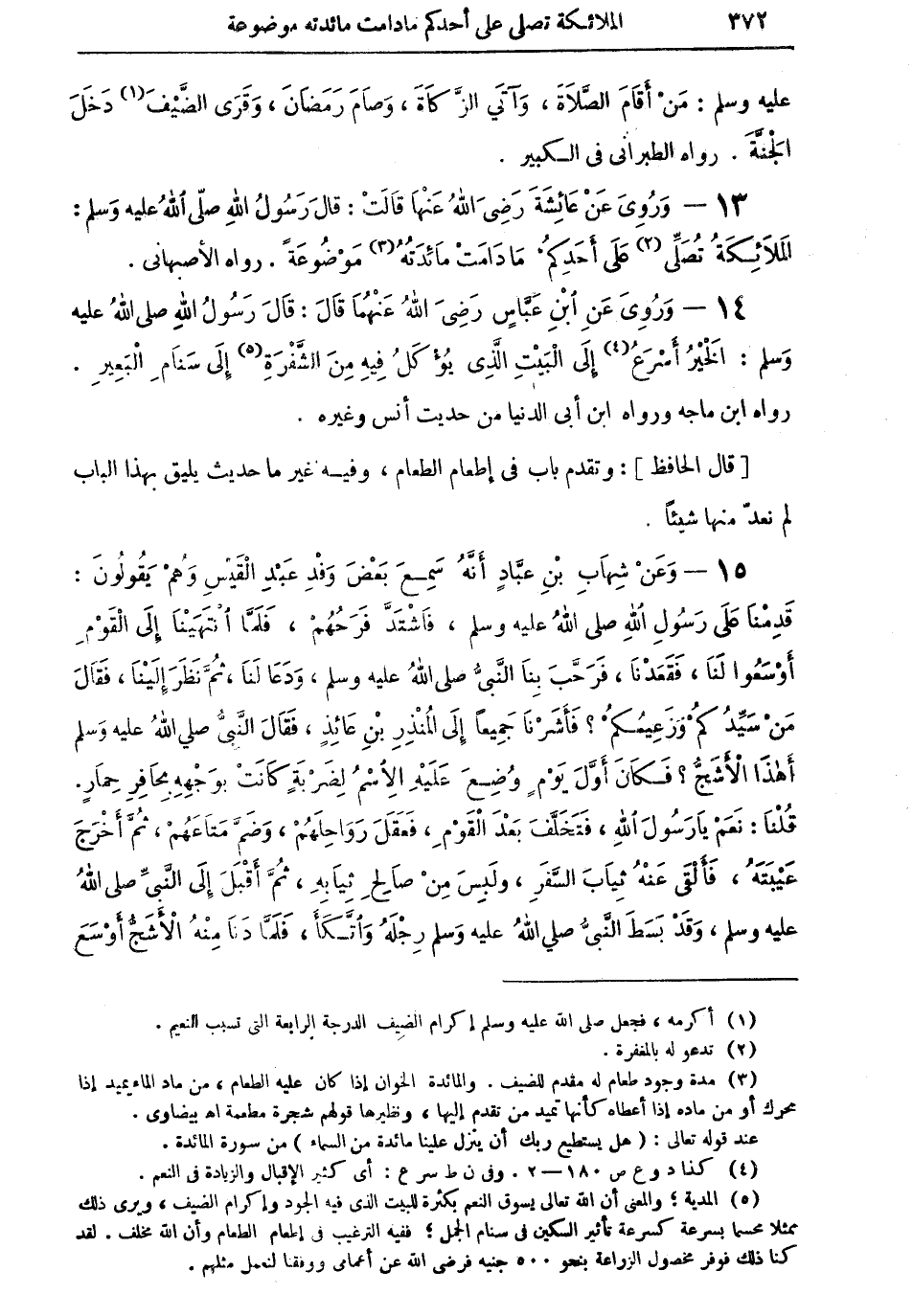 13 - ورويَ عن عائشة رضي الله عنها قالت: قال رسول الله صلى الله عليه وسلم: "الملائكة تُصلي (¬2) على أحدكم مادامت مائدتهُ (¬3) موضوعةً" رواه الأصبهاني.