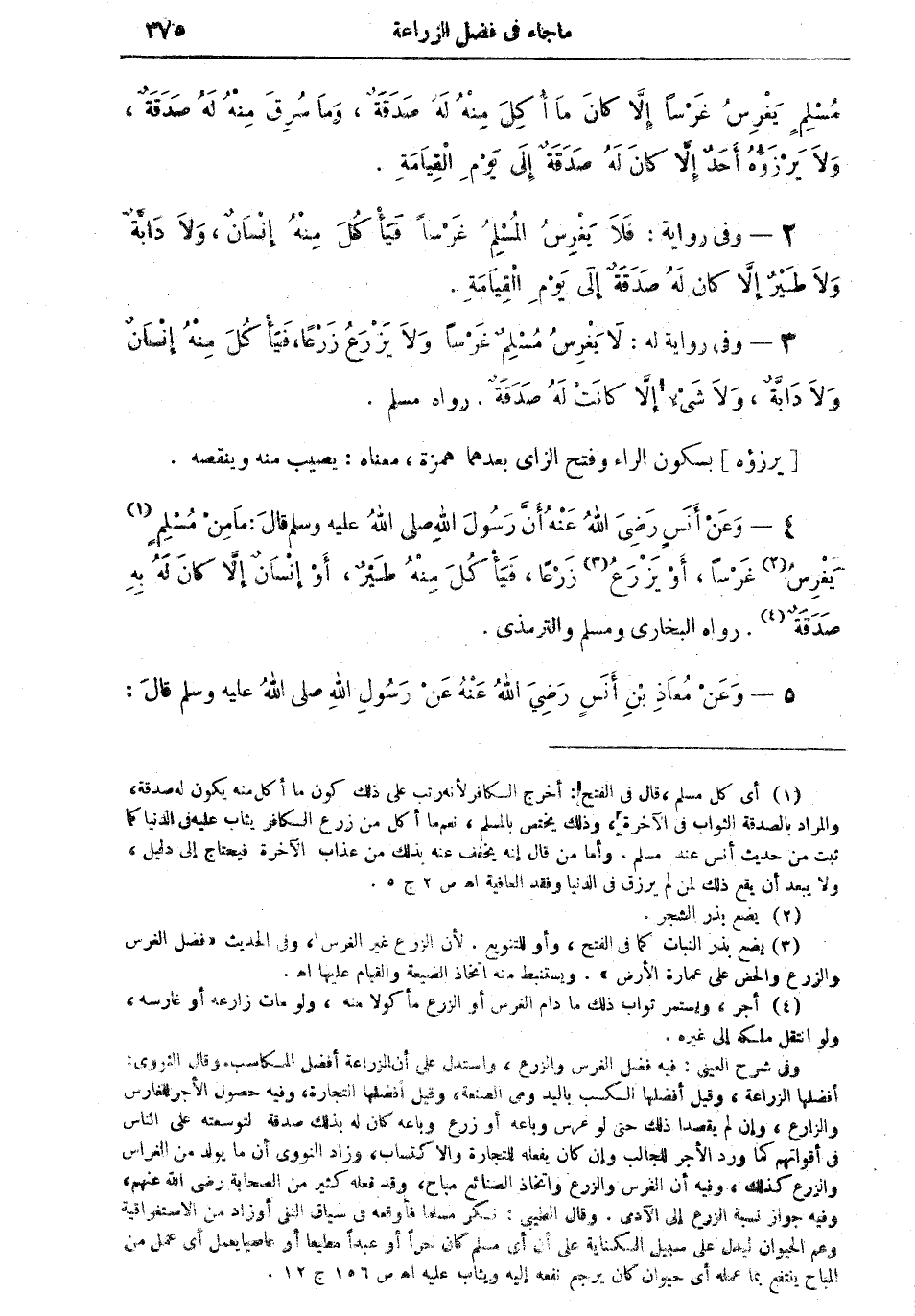 4 - وعن أنسٍ رضي الله عنه أن رسول الله صلى الله عليه وسلم قال: "ما من مسلمٍ (¬1) يغرسُ (¬2) غرساً، أو يزرعُ (¬3) زرعاً، فيأكلُ منه طيرٌ، أو إنسانٌ إلا كان له به صدقةٌ (¬4) " رواه البخاري ومسلم والترمذي.
