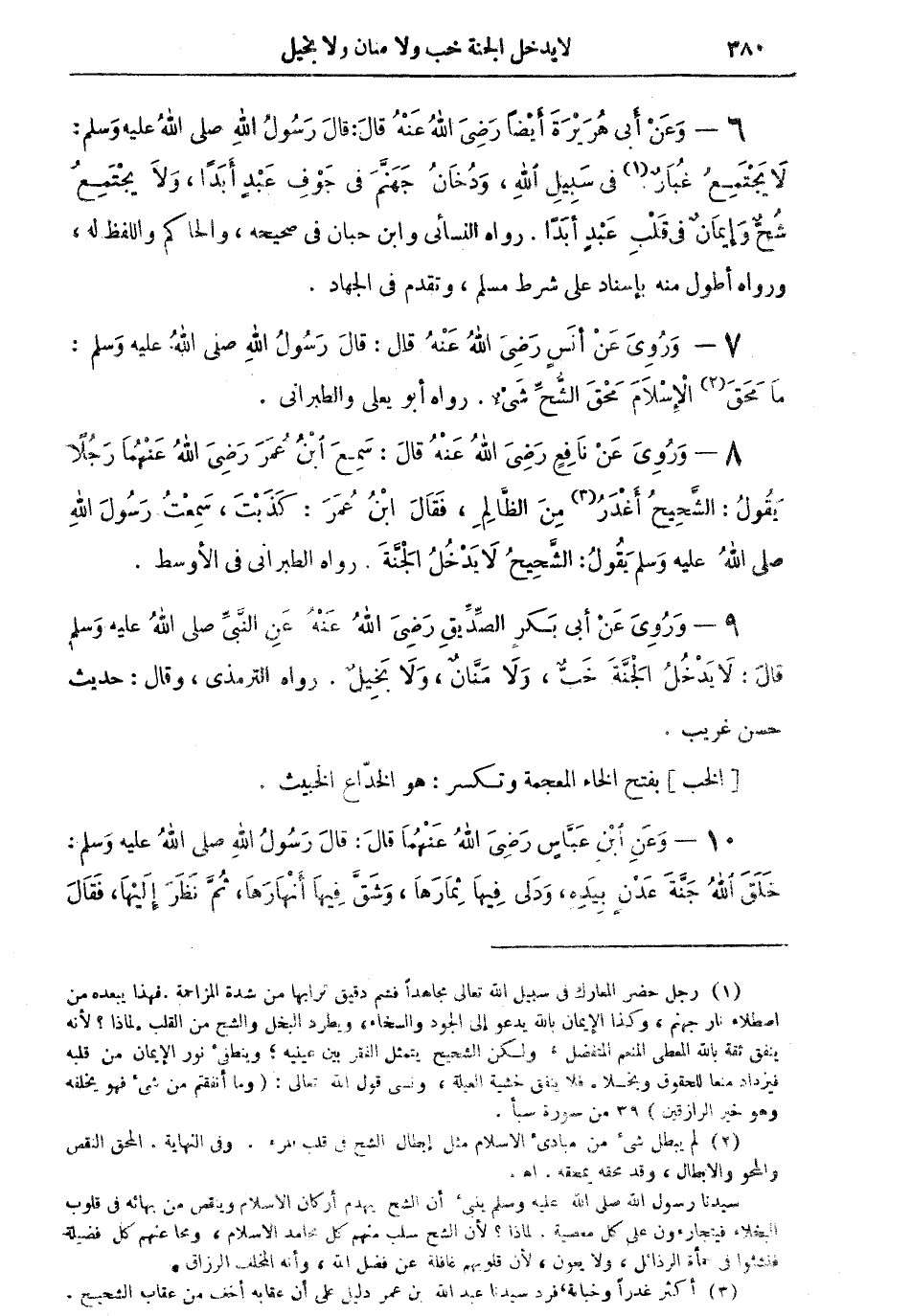 (¬1) رجل حضر المعارك في سبيل الله تعالى مجاهداً فشم دقيق ترابها من شدة المزاحمة، فهذا يبعده من اصطلاء نار جهنم، وكذا الإيمان بالله يدعو إلى الجود والسخا، ويطرد البخل والشح من القلب. لماذا؟ لأنه ينفق ثقة بالله المعطي المنعم المتفضل، ولكن الشحيح يتمثل الفقر بين عينيه؛ وينطفئ نور الإيمان من قلبه فيزداد منعاً للحقوق وبخلاً. فلا ينفق خشية العيلة، ونسي قول الله تعالى: "وما أنفقتم من شيء فهو يخلفه وهو خير الرازقين" (39 من سورة سبأ).