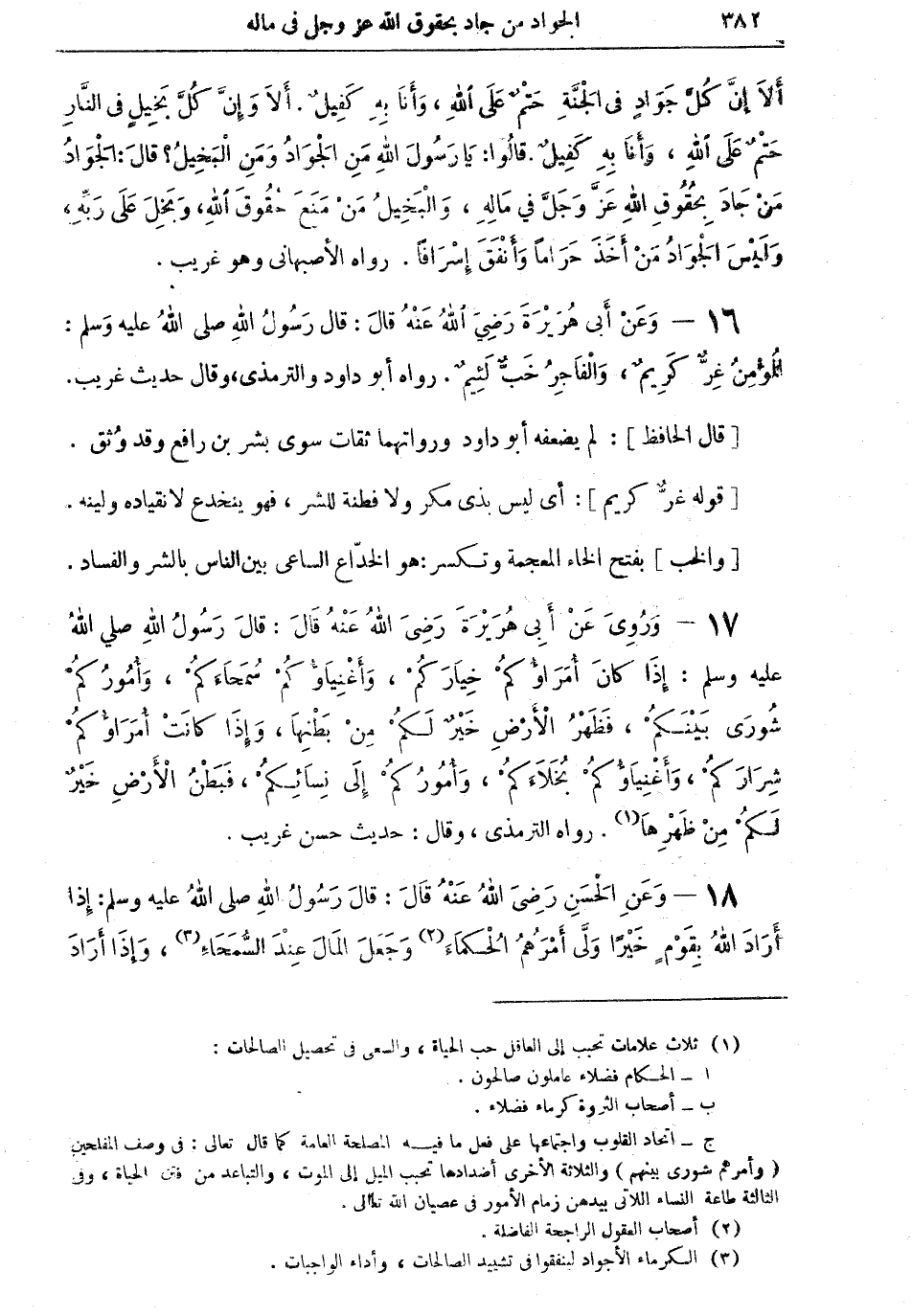 "ألا إن كُلَّ جَوَادٍ في الجنة حَتْمٌ على الله، وأنا به كفيلٌ. ألا وإن كُلَّ بخيلٍ في النار حَتْمٌ على اللهِ، وأنا به كفيلٌ. قالوا: يا رسول الله مَنِ الجوادُ وَمَنِ البخيلُ؟ قال: الجوادُ مَنْ جَأدَ بِحقوقِ الله عز وجل في ماله، والبخيلُ من منعَ حقوق الله، وبخلَ على ربه، وليس الجوادُ من أخذَ حراماً وأنفقَ إسرافاً" رواه الأصبهاني وهو غريب.