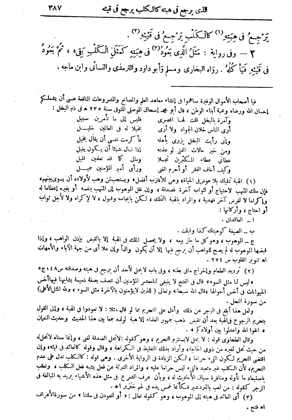 2 - وفي رواية: "مثل الذي يَعُودُ (¬3) في هِبَتِهِ كَمَثَلِ الكلب يَقيء، ثم يعود في قَيْئِهِ فيأكلهُ" رواه البخاري ومسلم وأبو داود والترمذي والنسائي وابن ماجة.